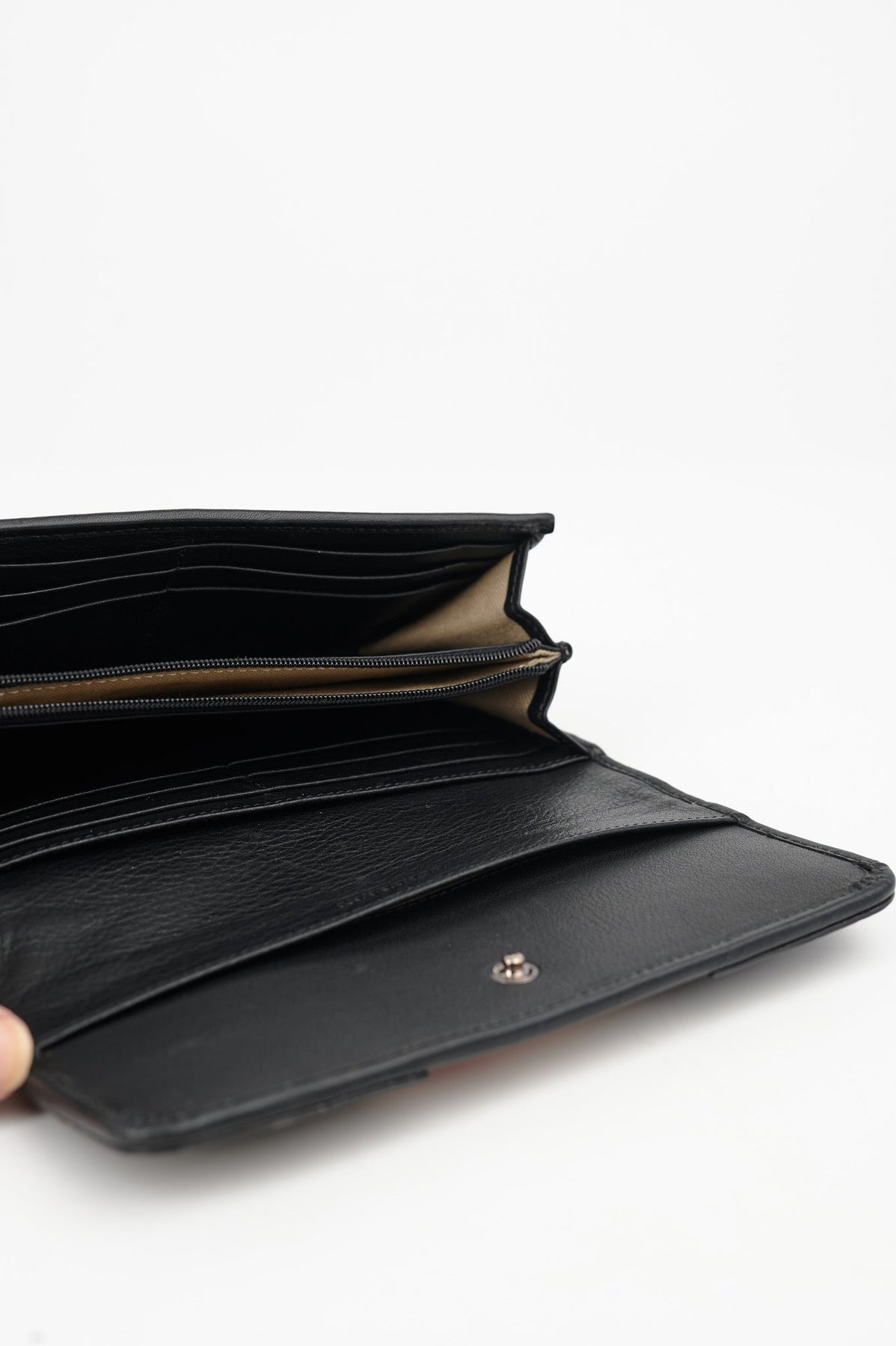 Two large slots, one zipper slot, card slots, and two sections