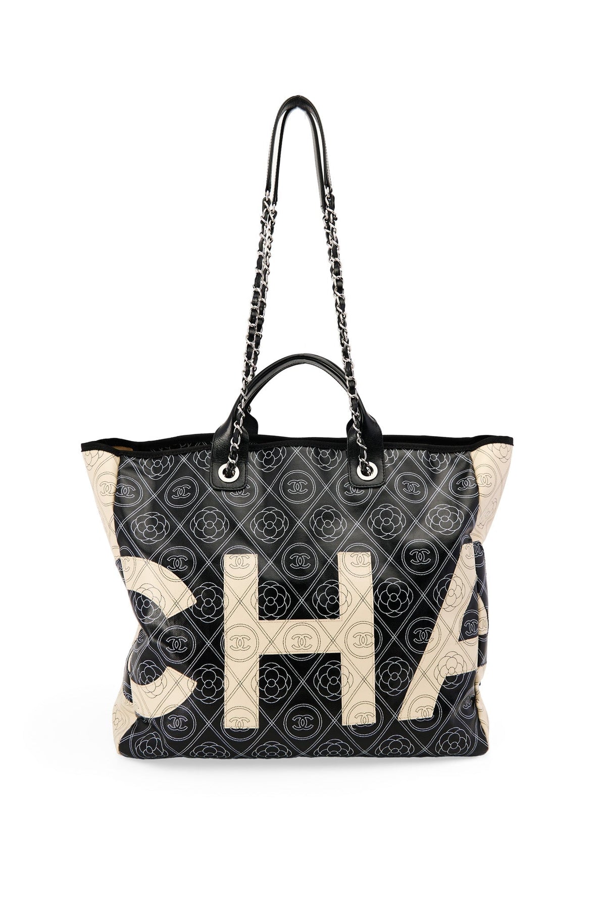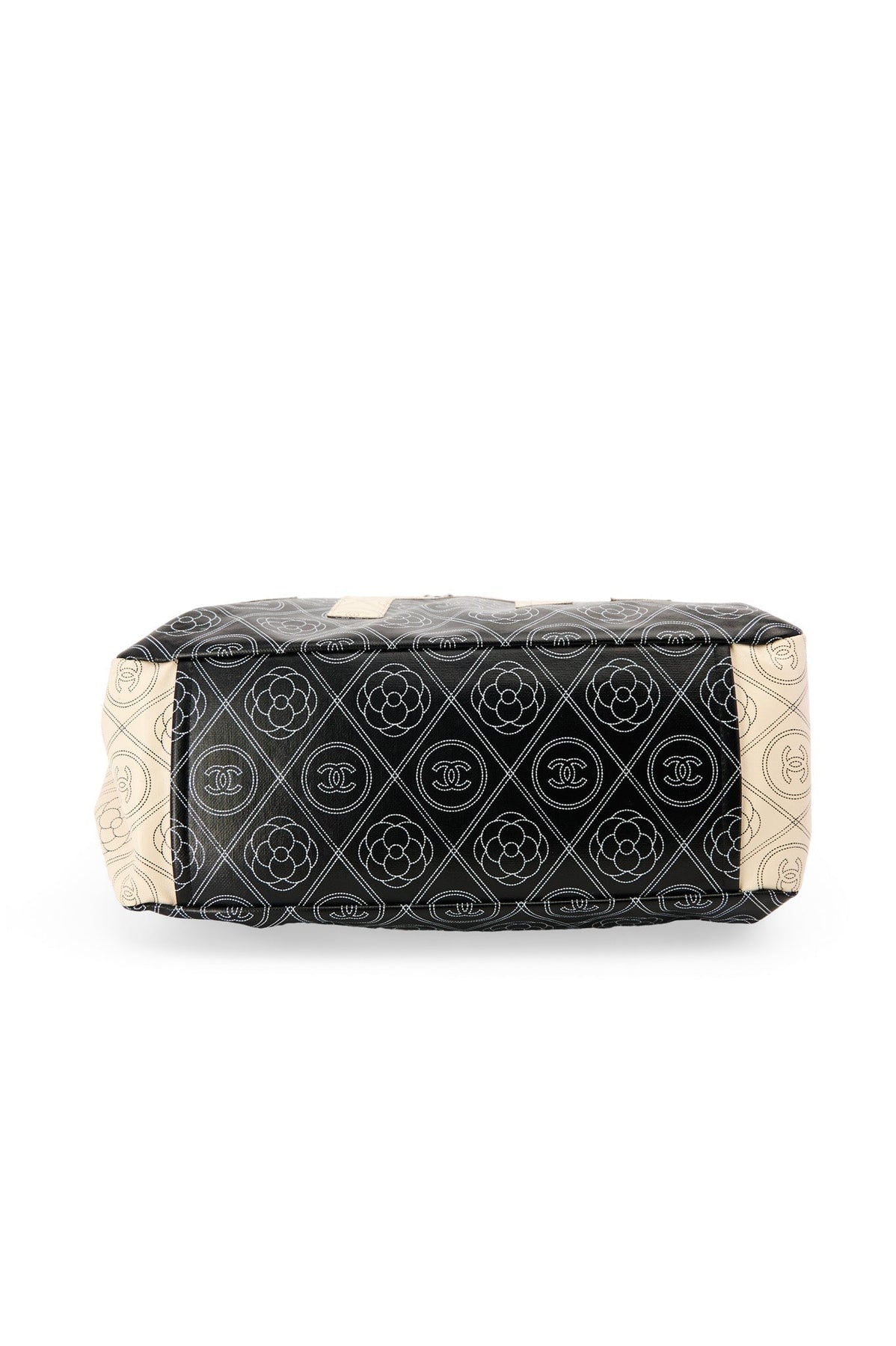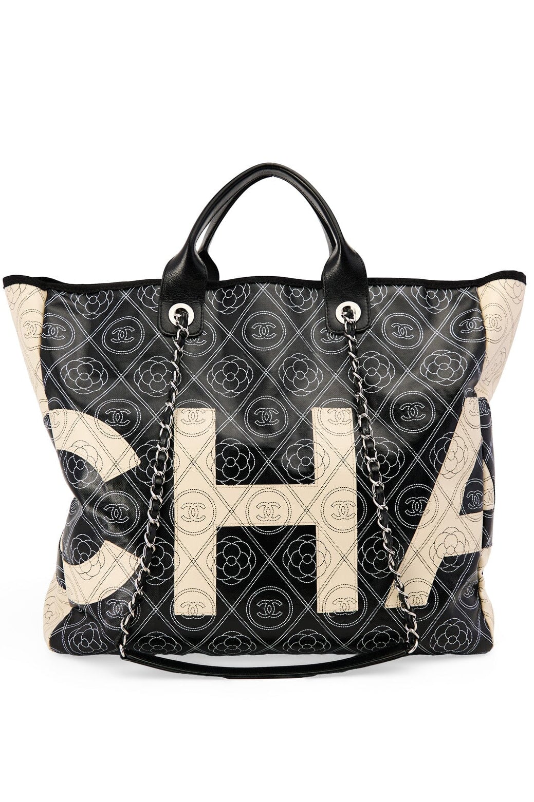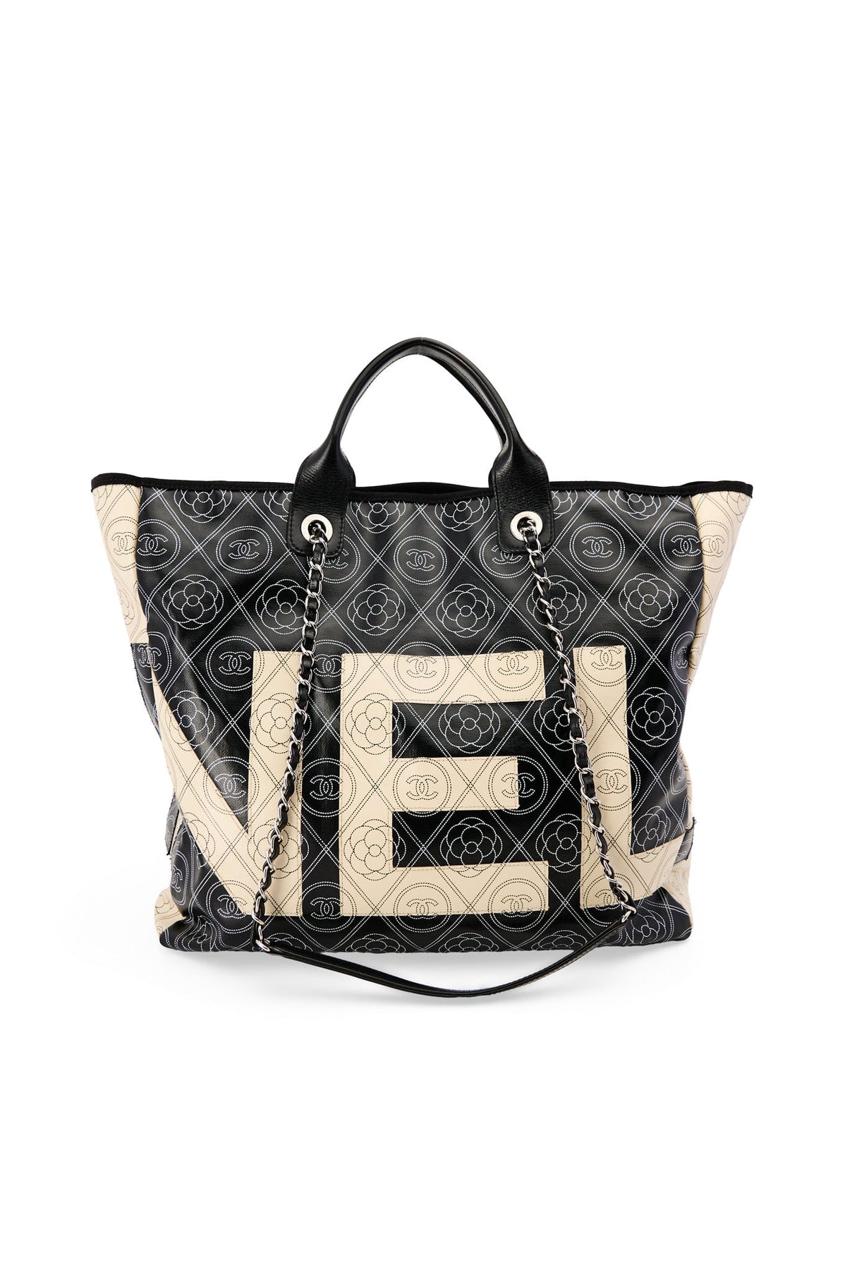 Pre-loved Chanel Coco Mark Camelia Tote in black and cream