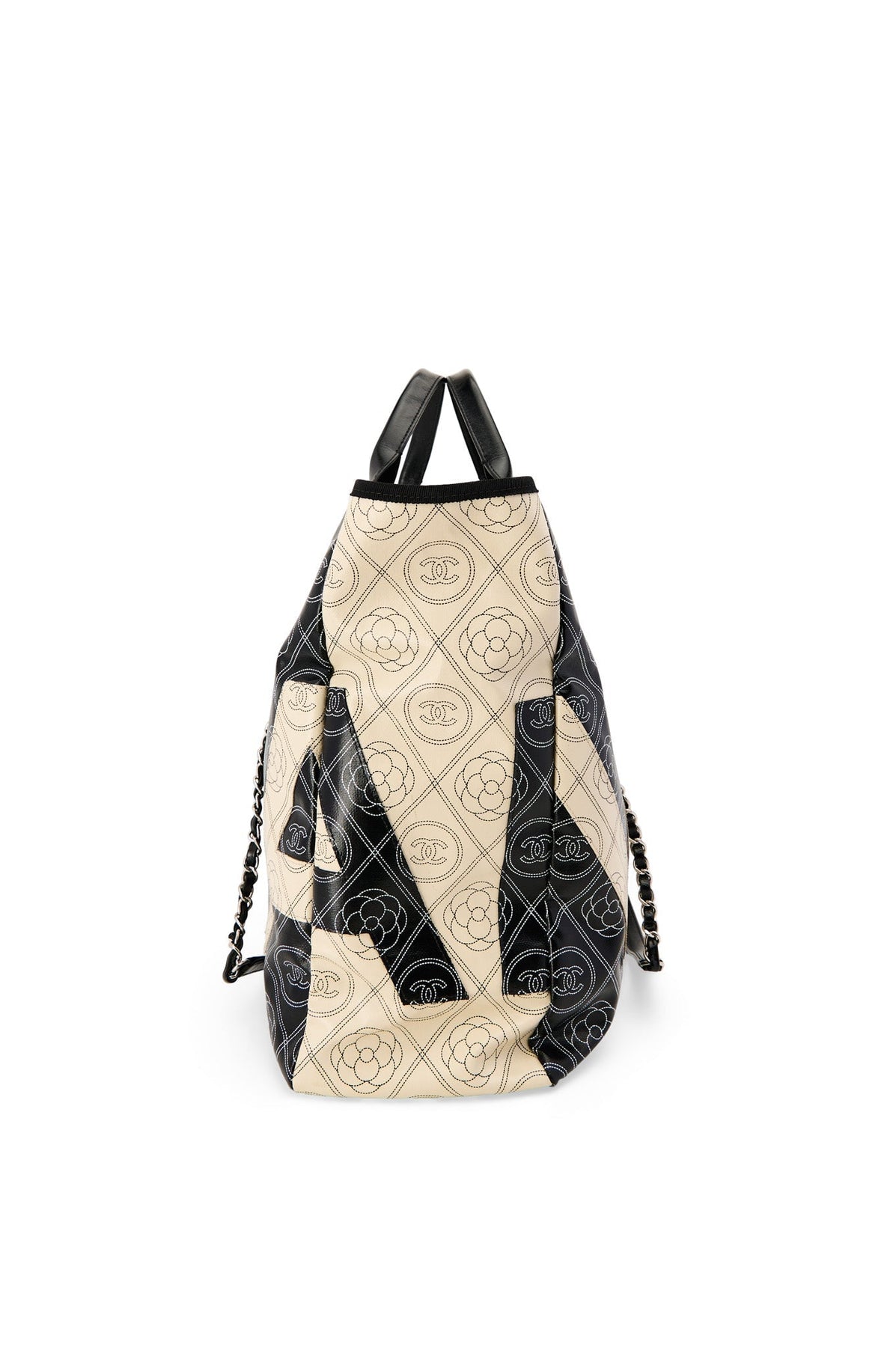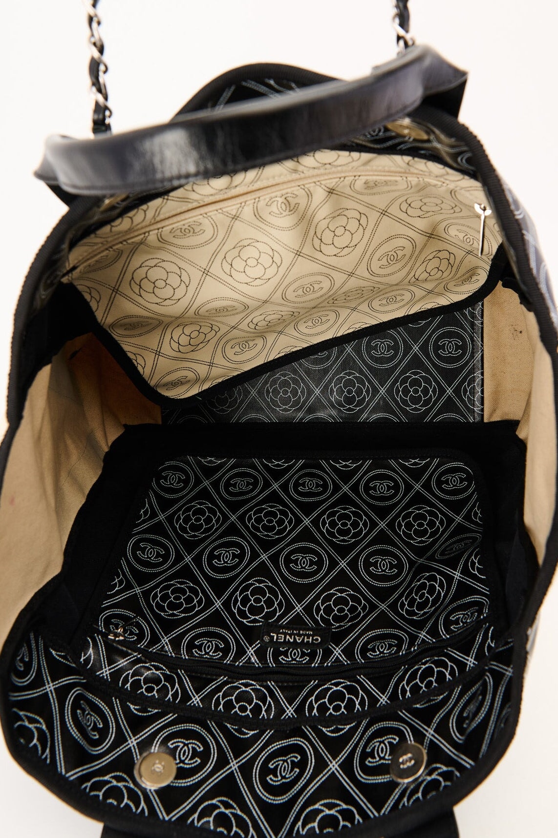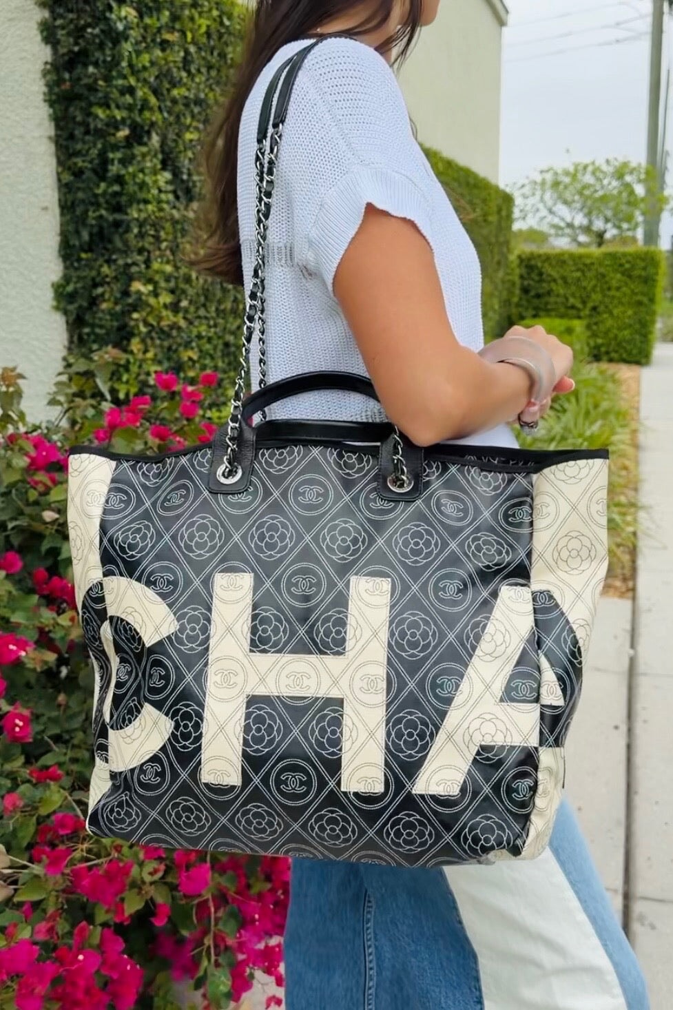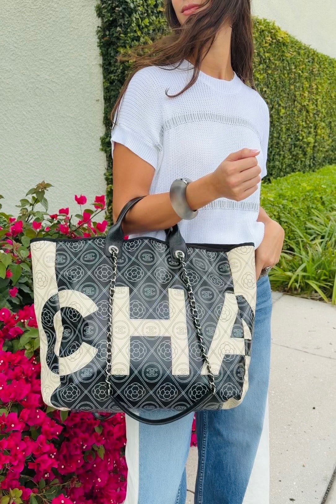Pre-loved Chanel Coco Mark Camelia Tote in black and cream