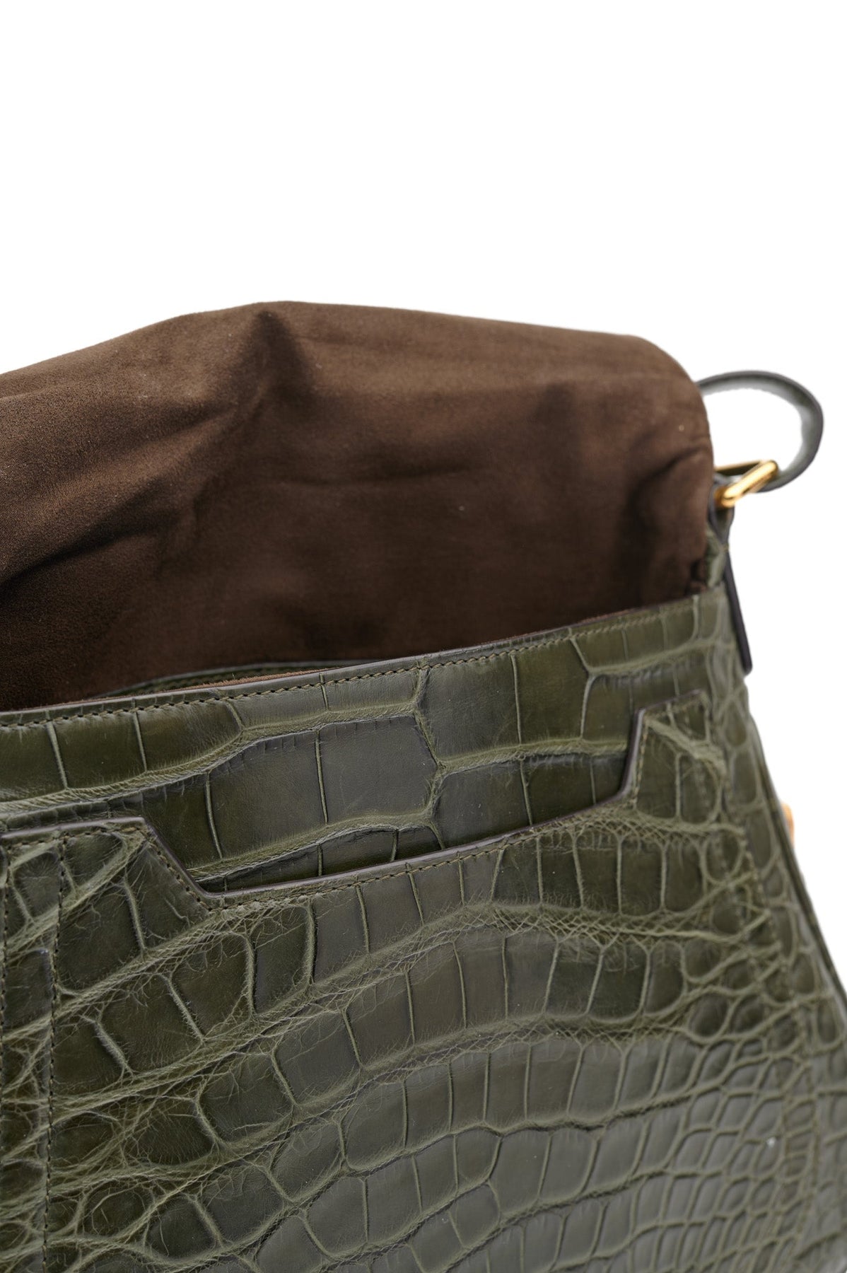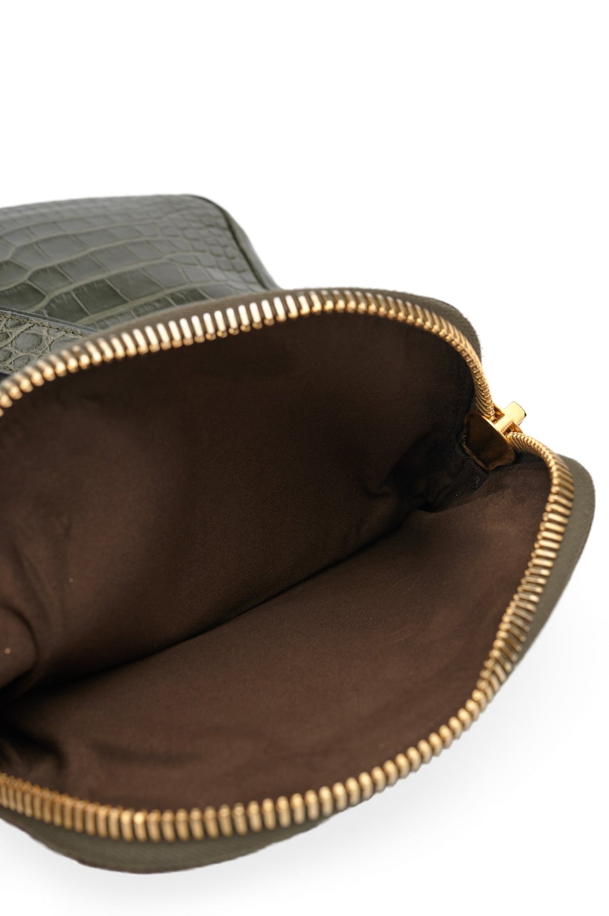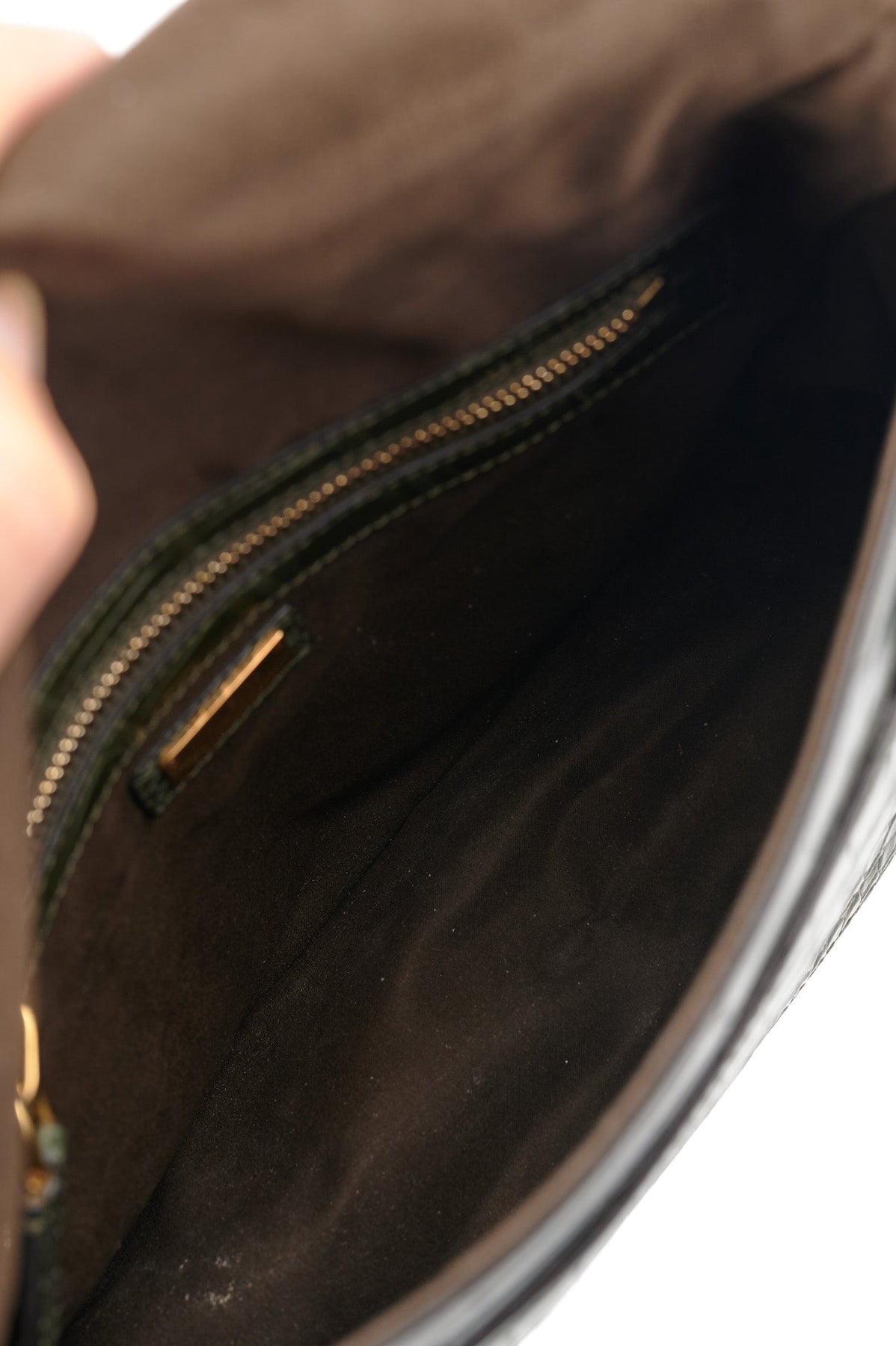 Brown suede interior with one zipper pocket and one additional pocket