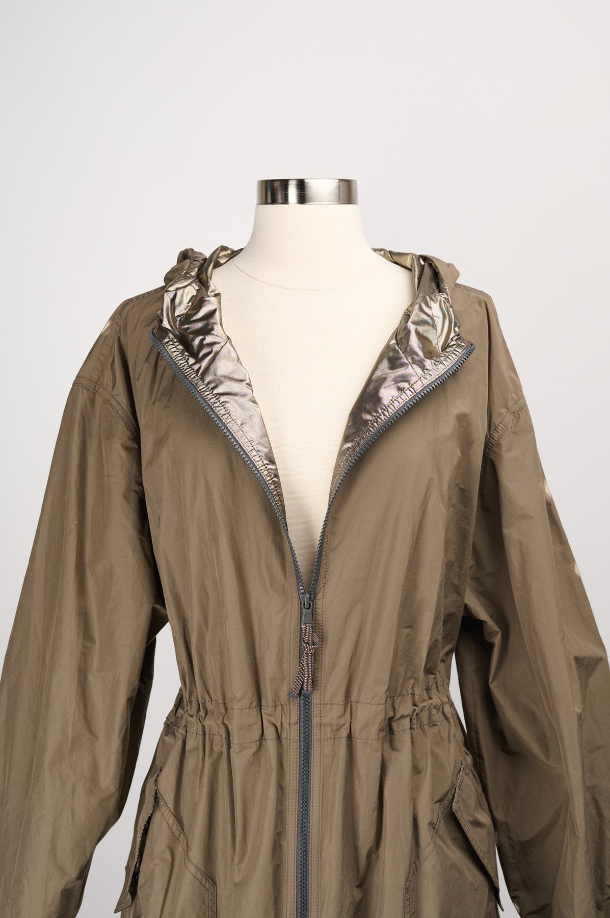 Drawstring hood, waist, and hemline