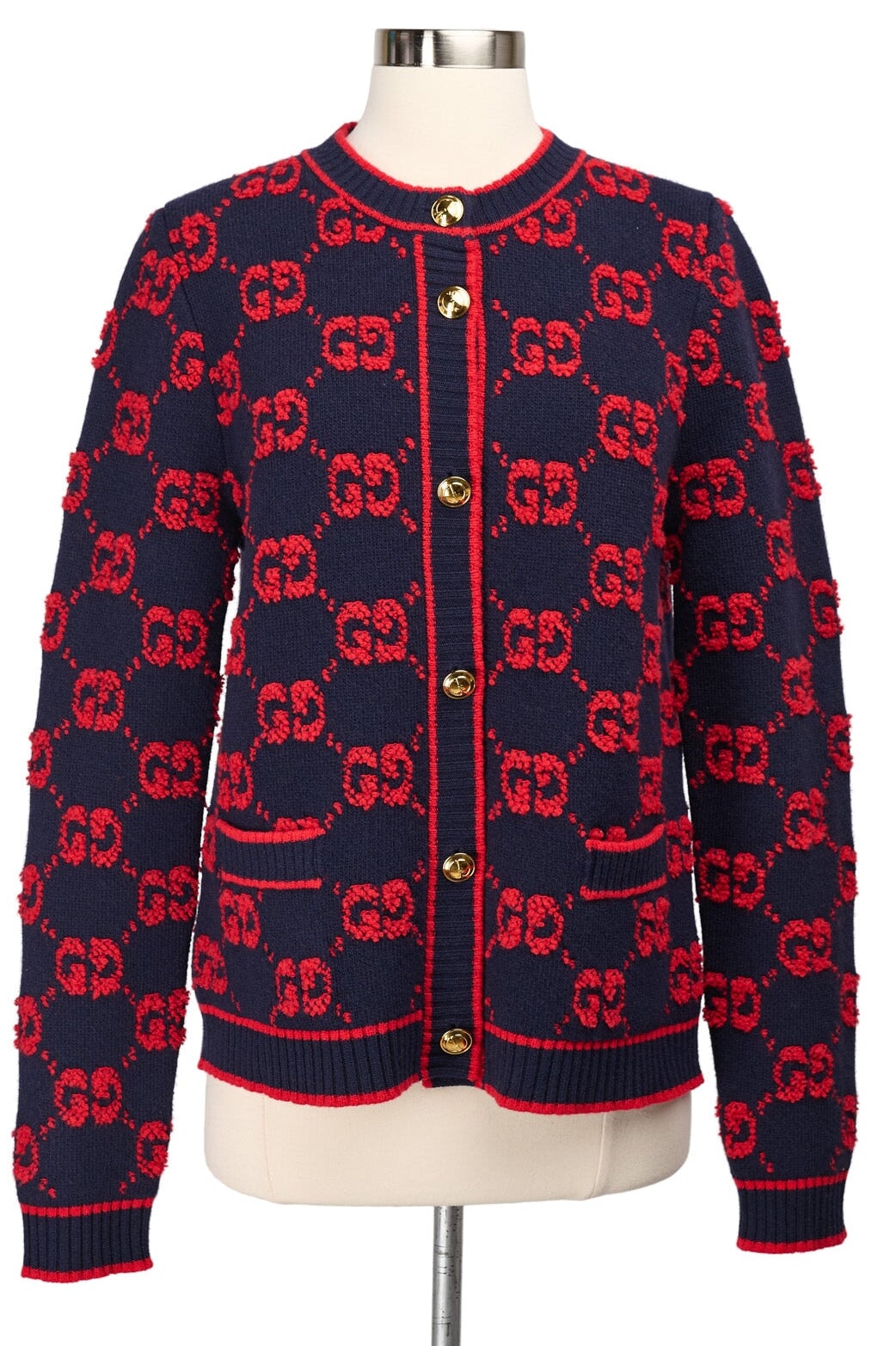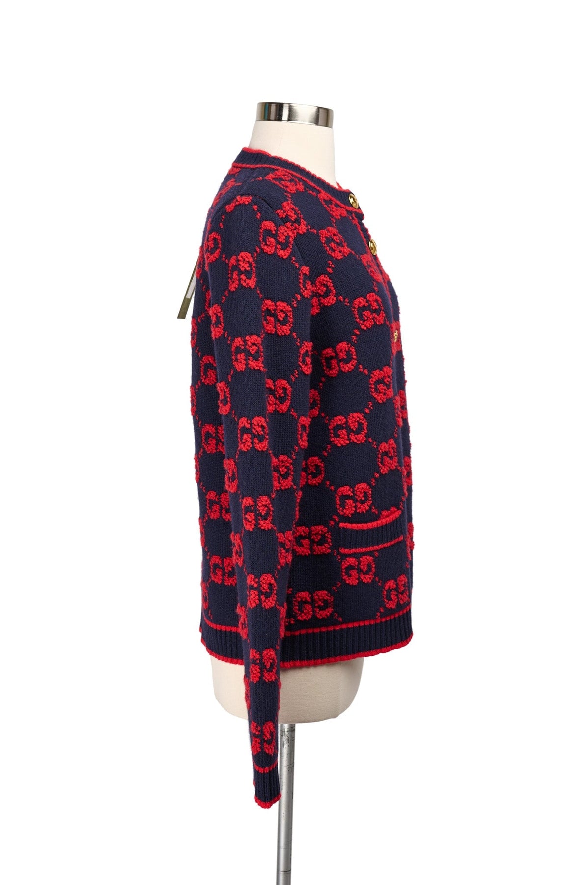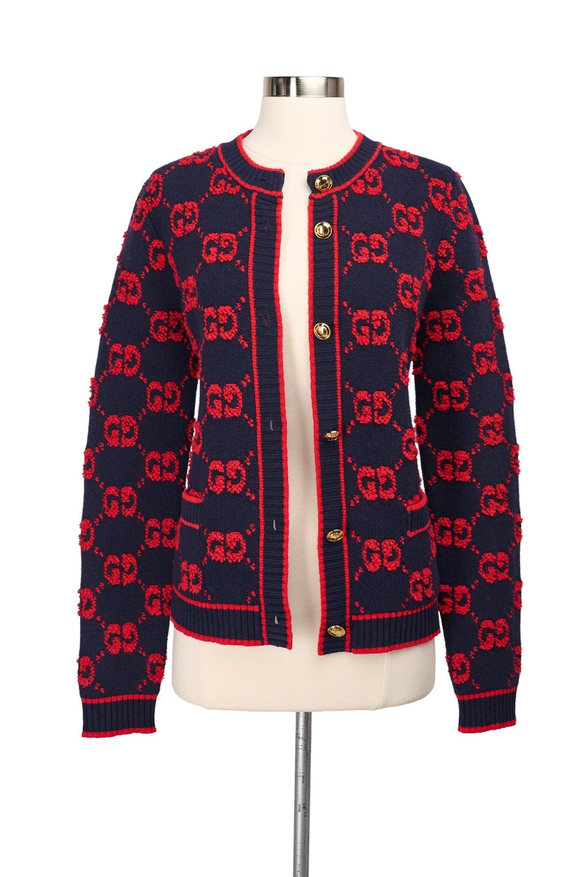 Pre-loved Gucci Monogram Cardigan in navy and red
