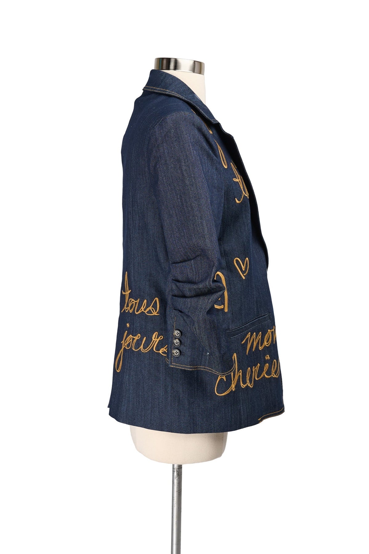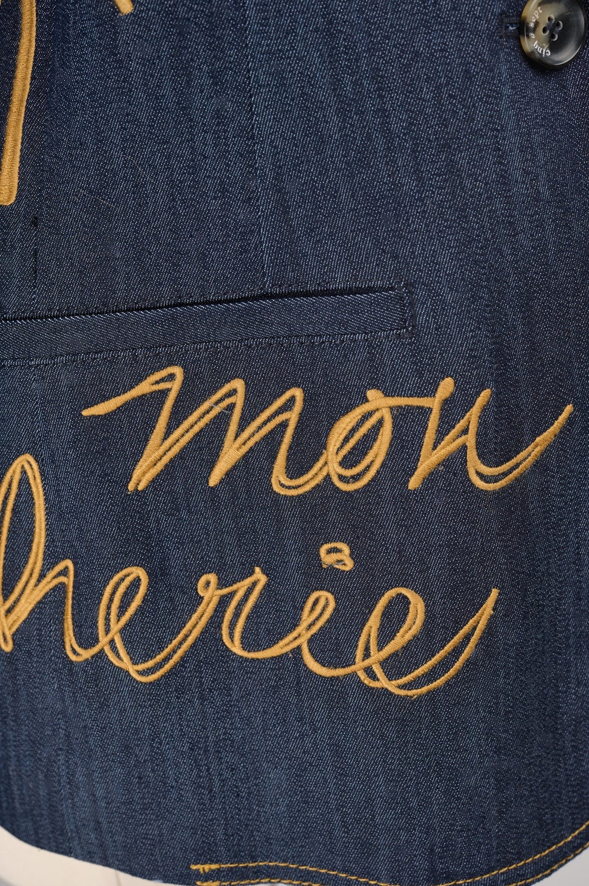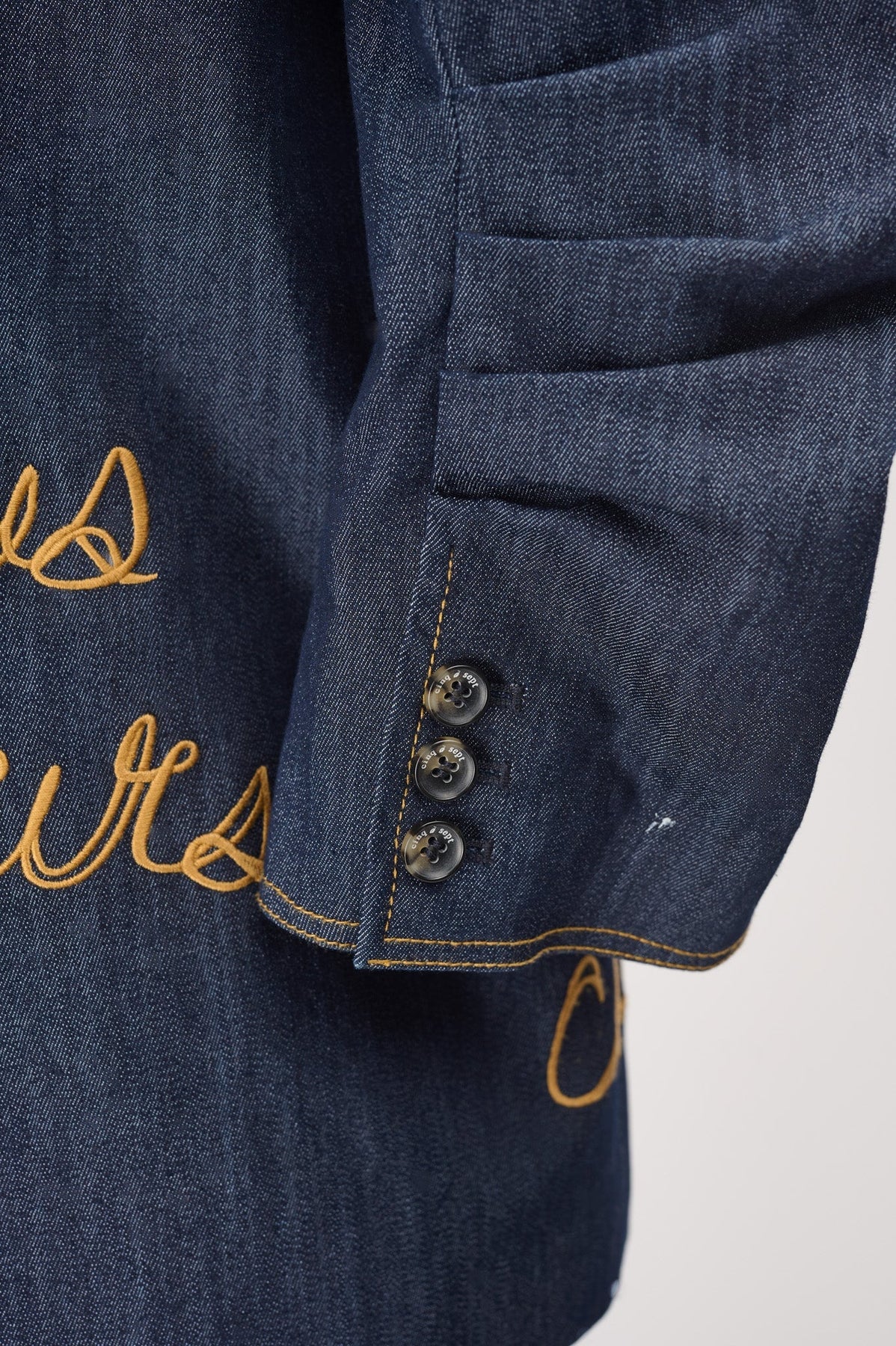 Embroidered with gold script text