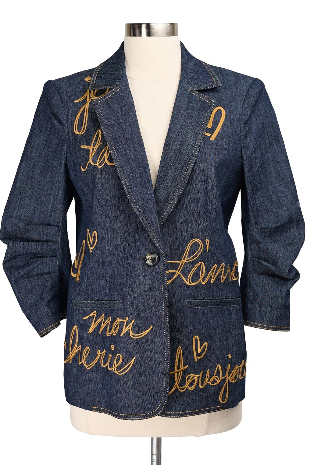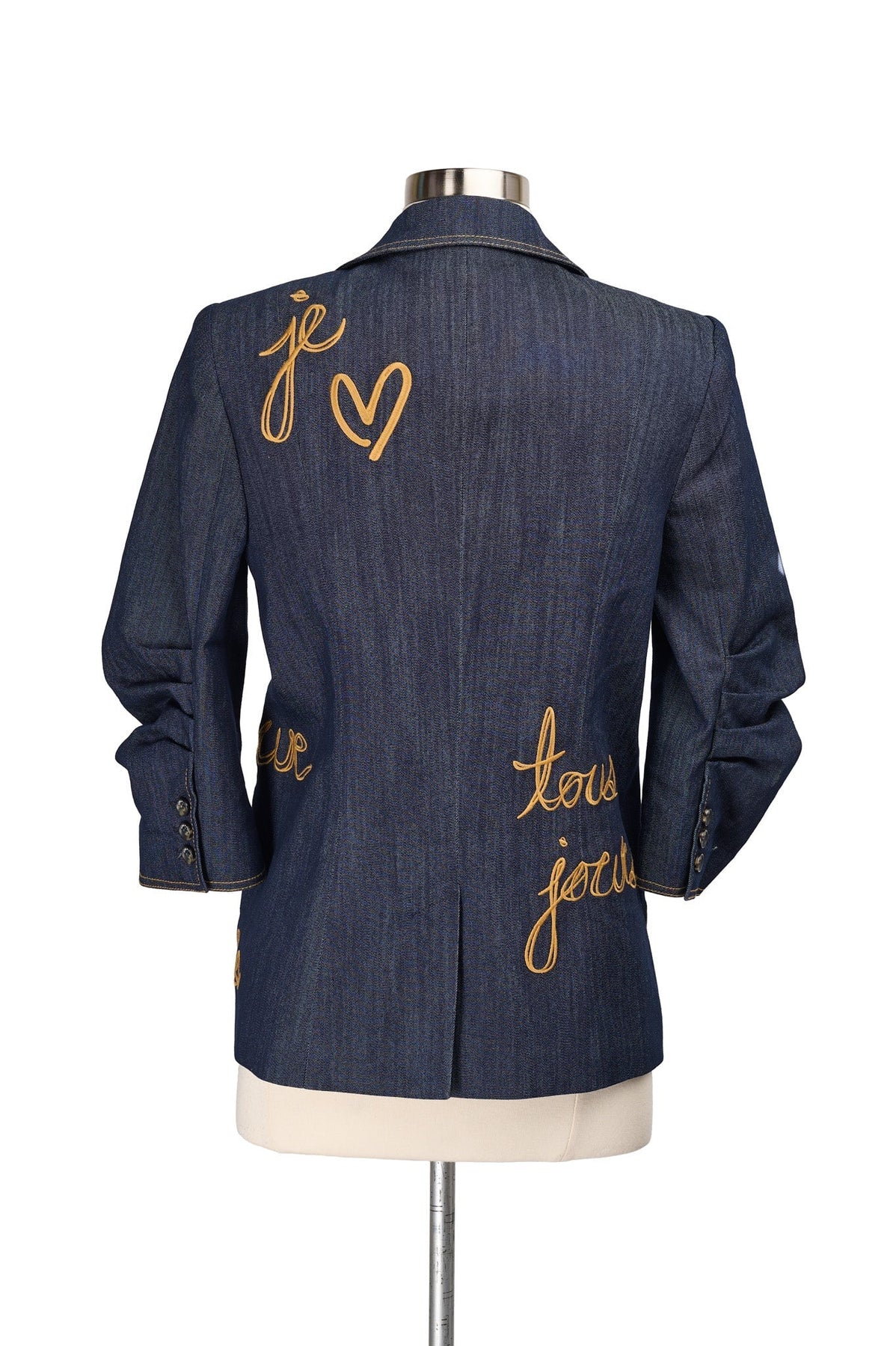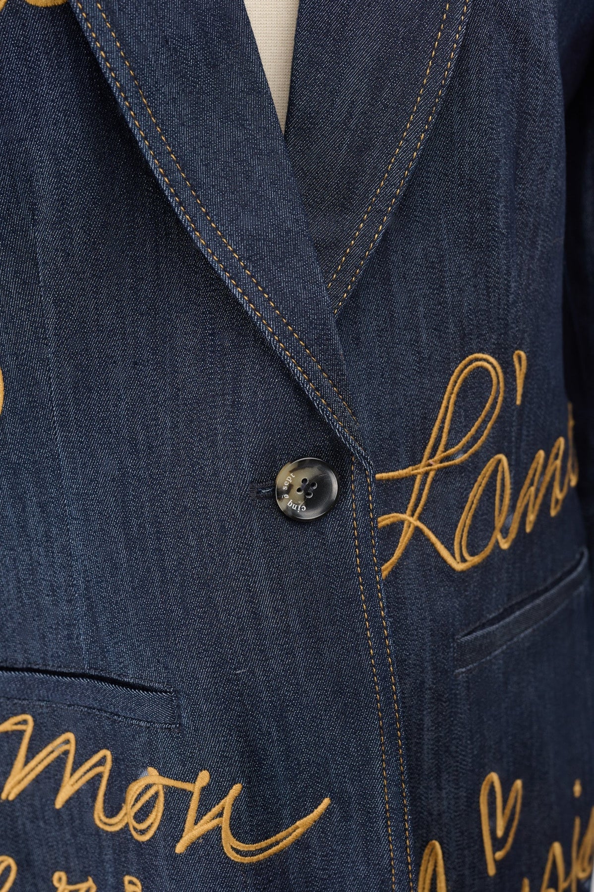 Embroidered with gold script text
