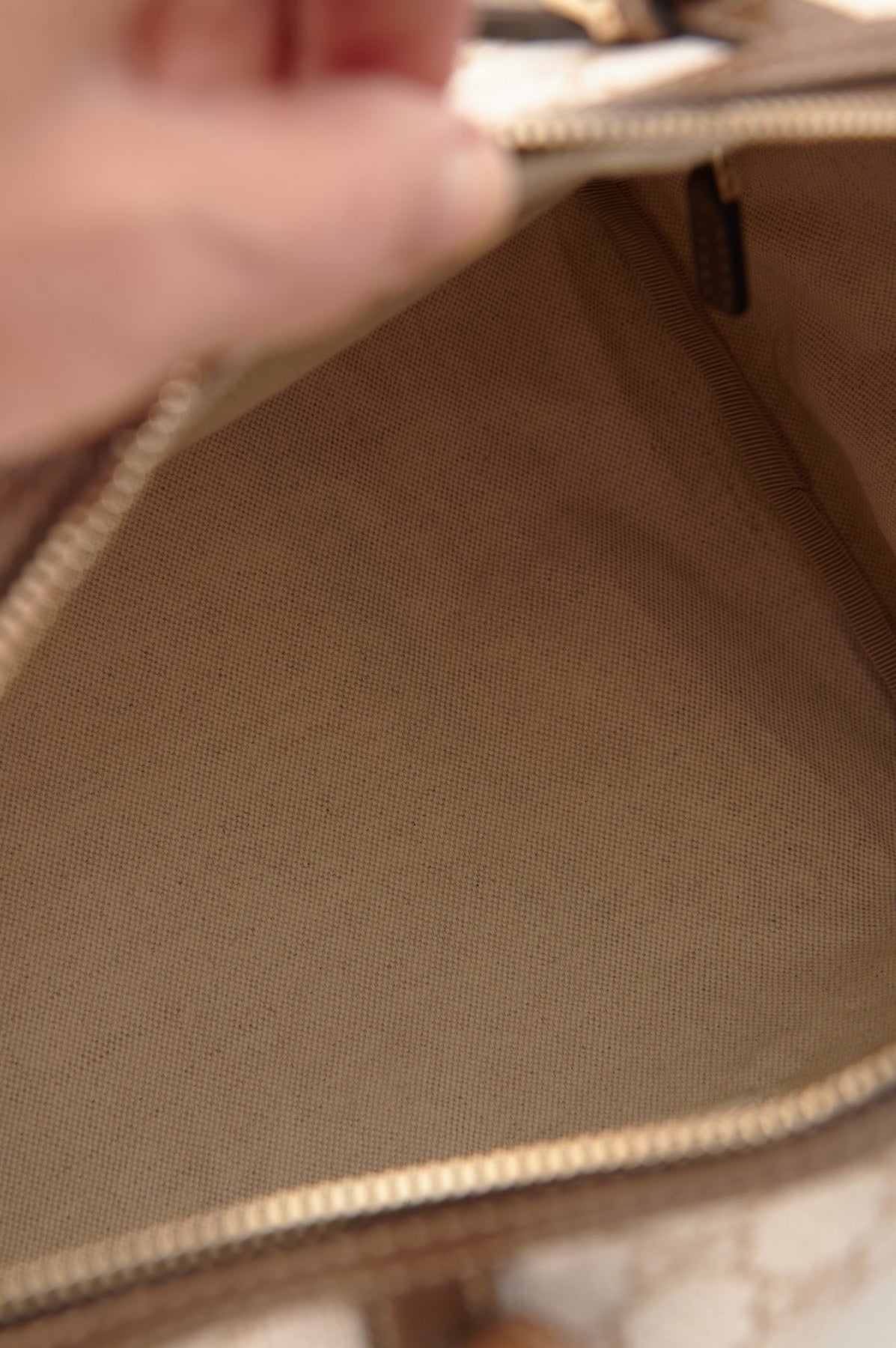 Beige canvas interior with three pockets, one with a zipper