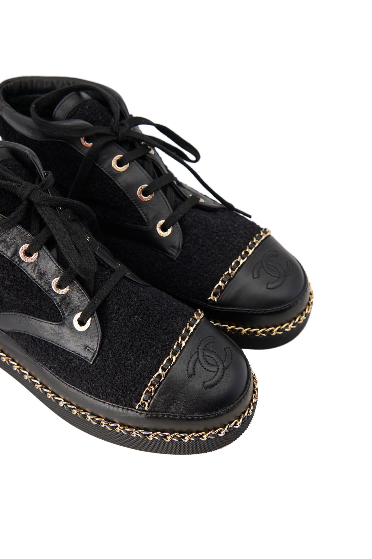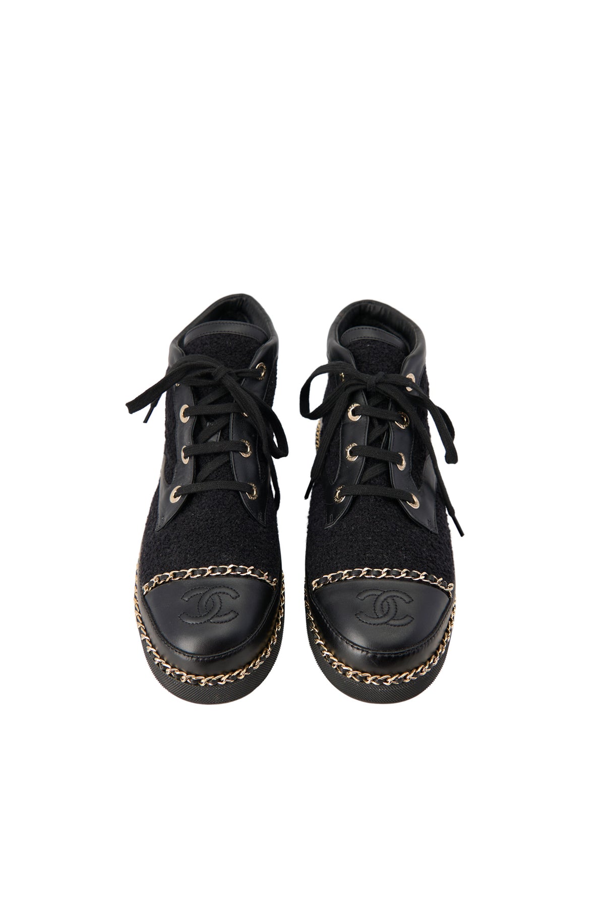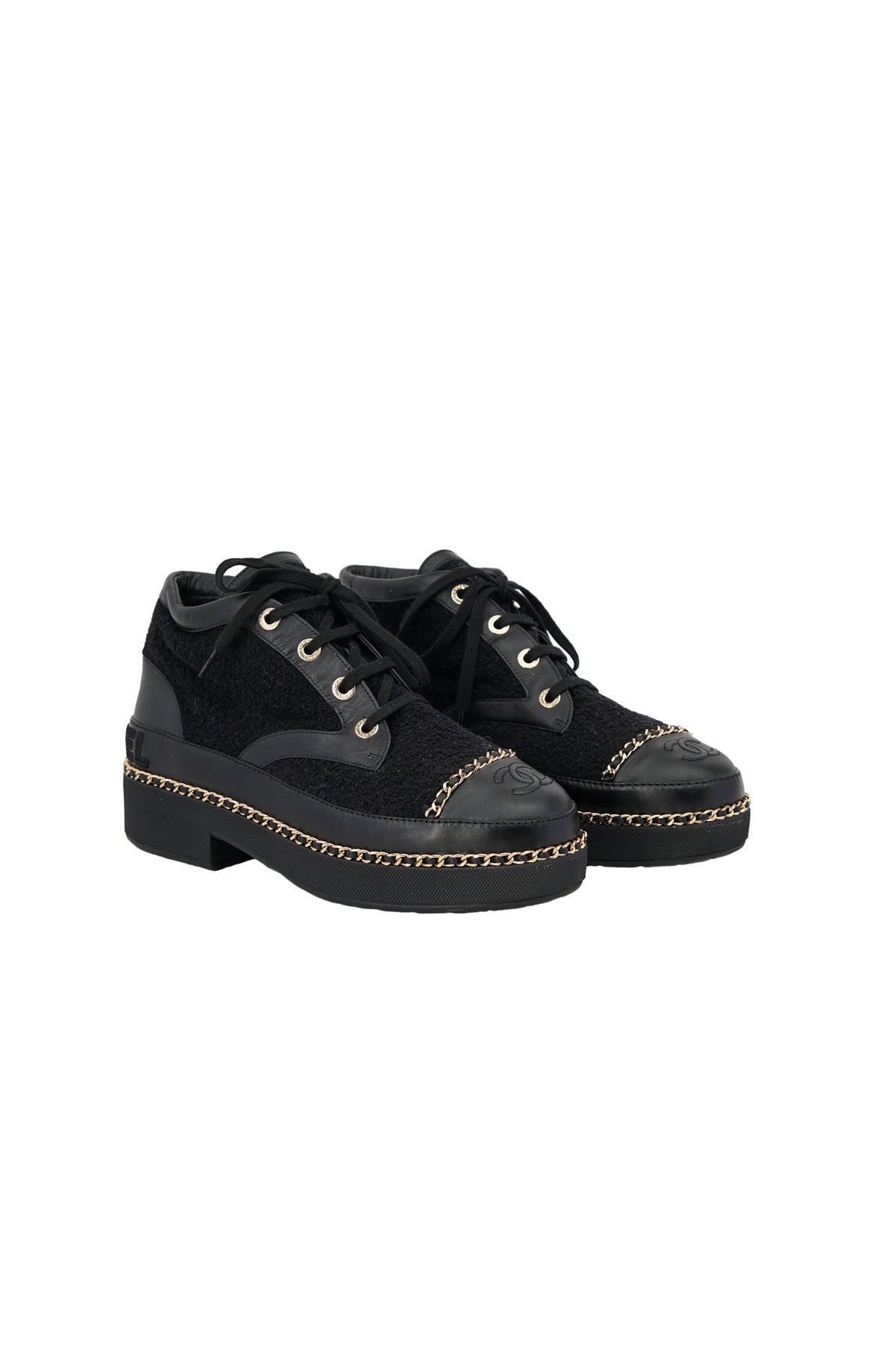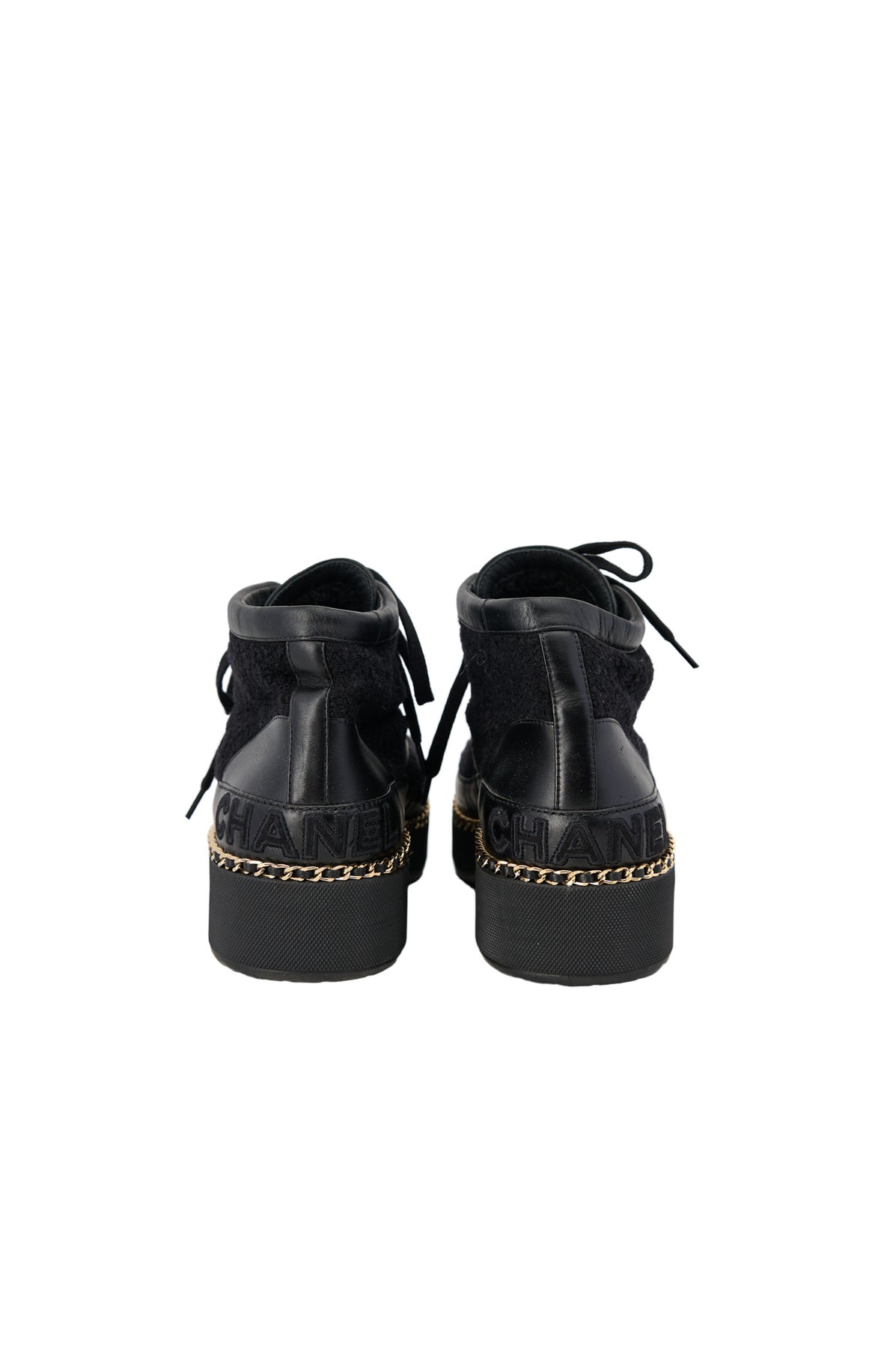 Pre-loved Chanel Chain Tweedy Biker Boots in black