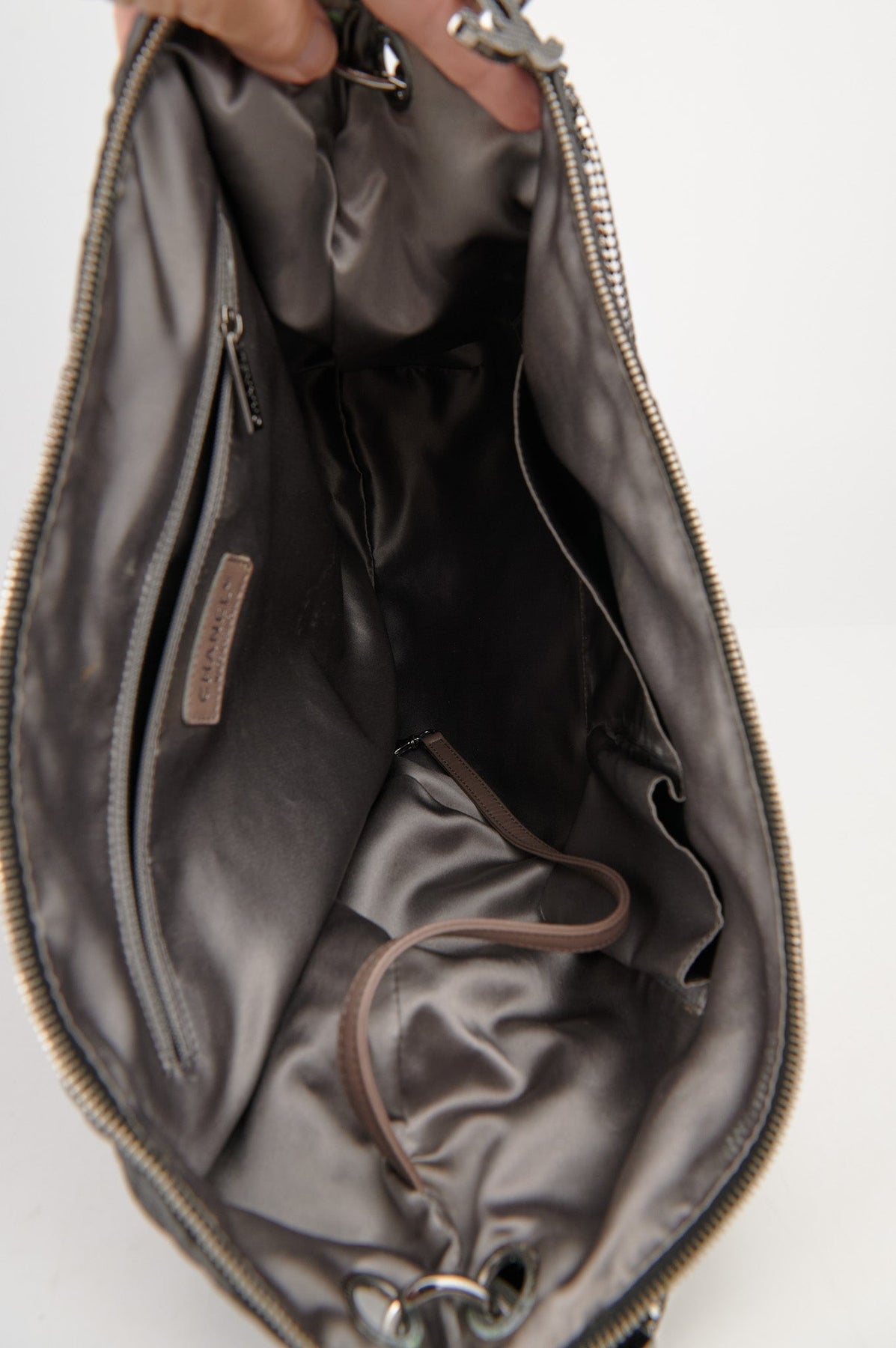 Grey satin interior with three pockets, one with a zipper