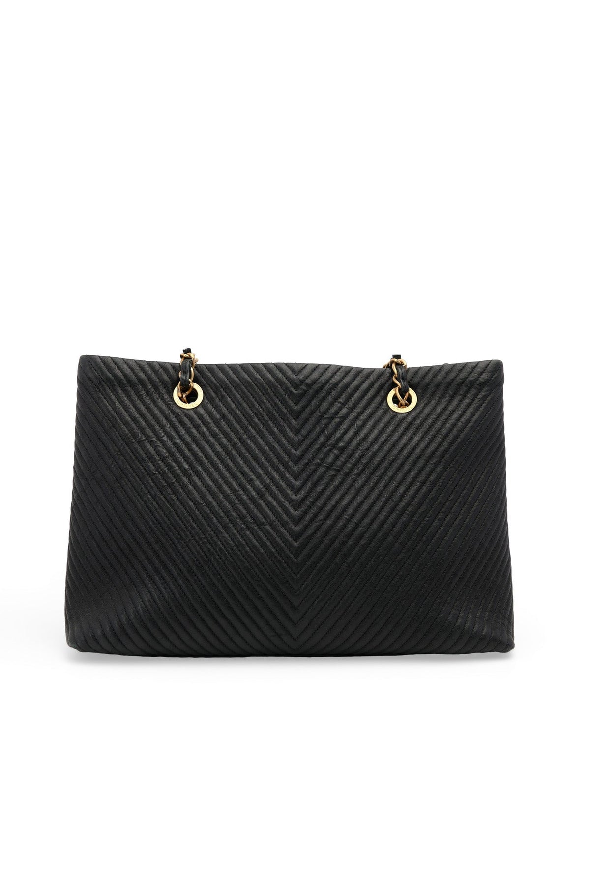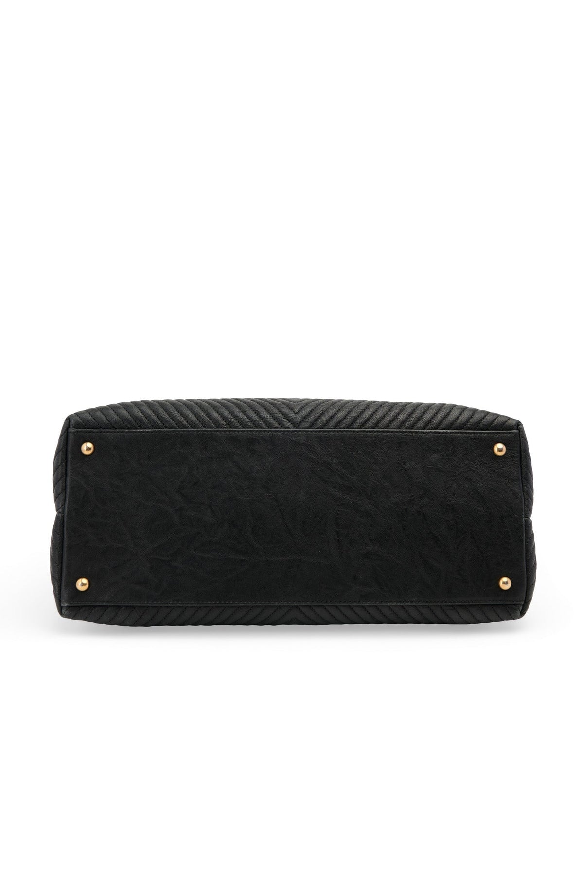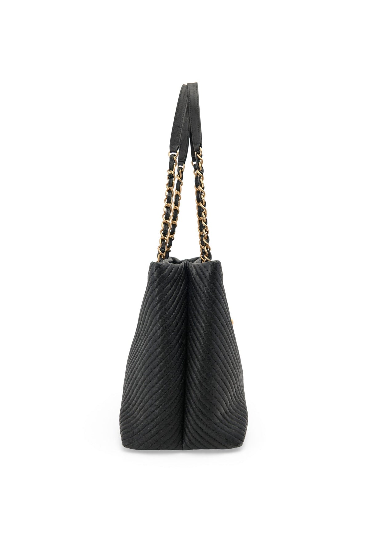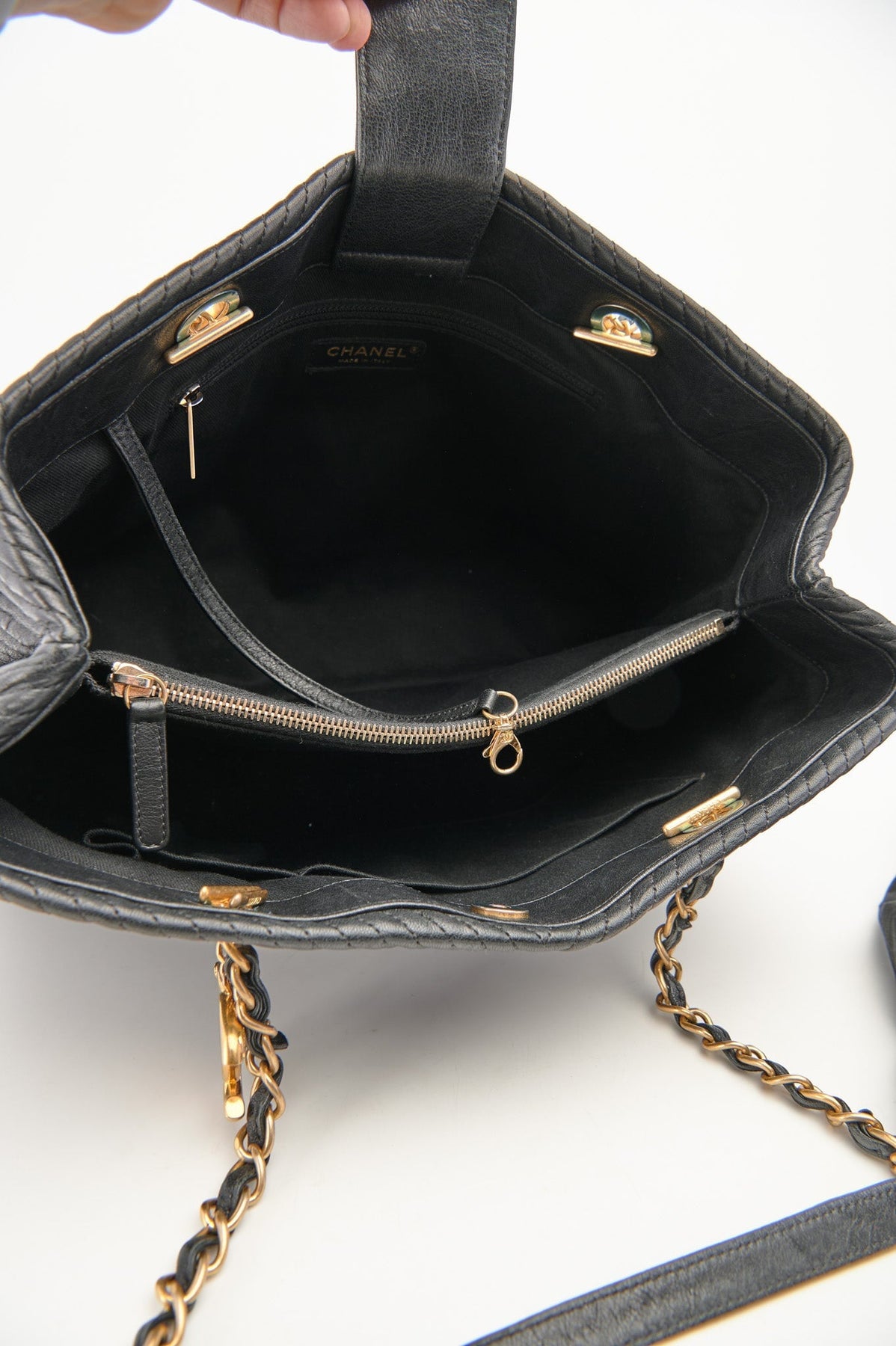 Black fabric interior with center zipper section and one zipper pocket on one side and an additional pocket on the other side