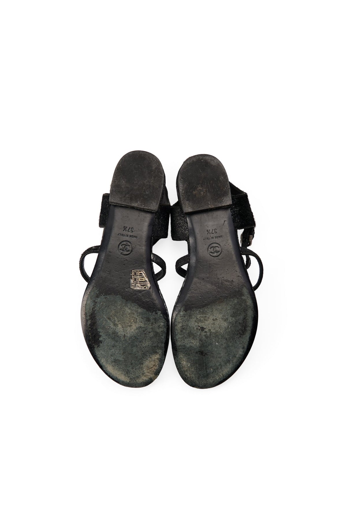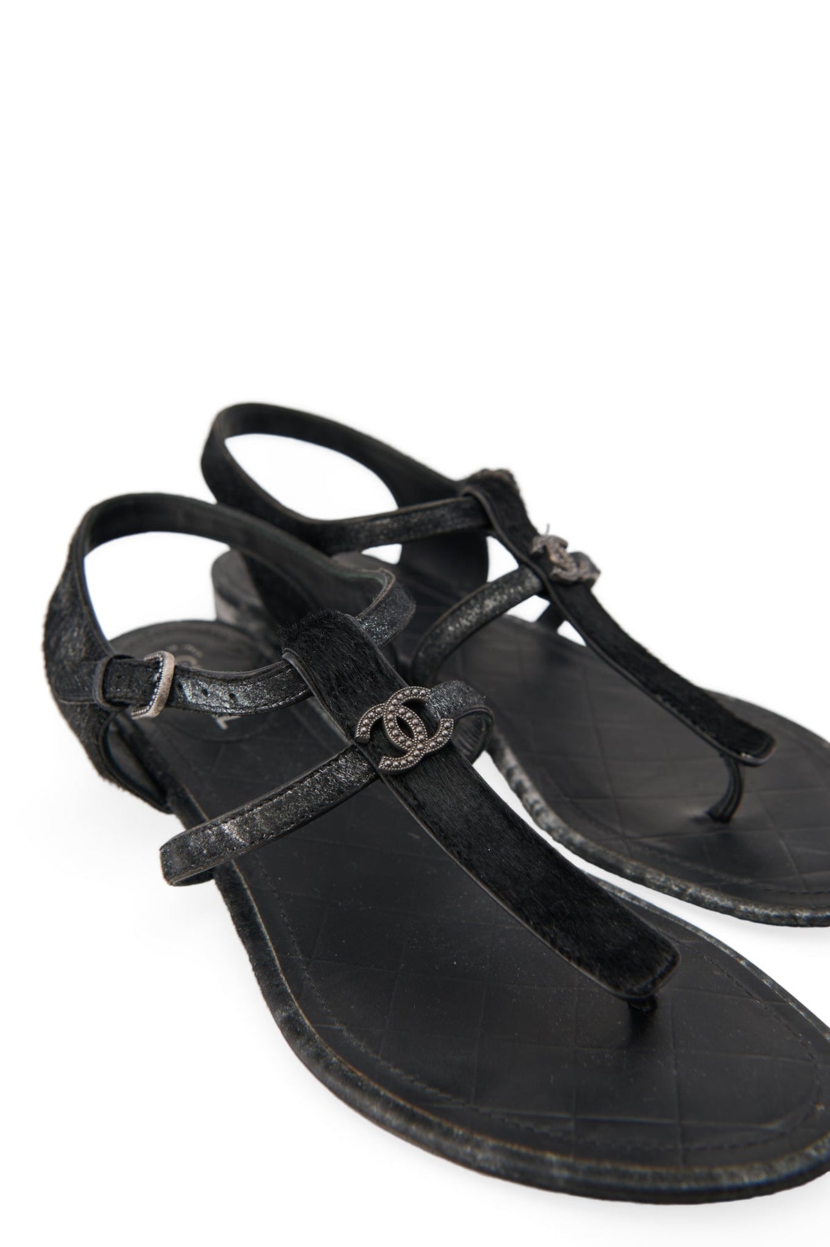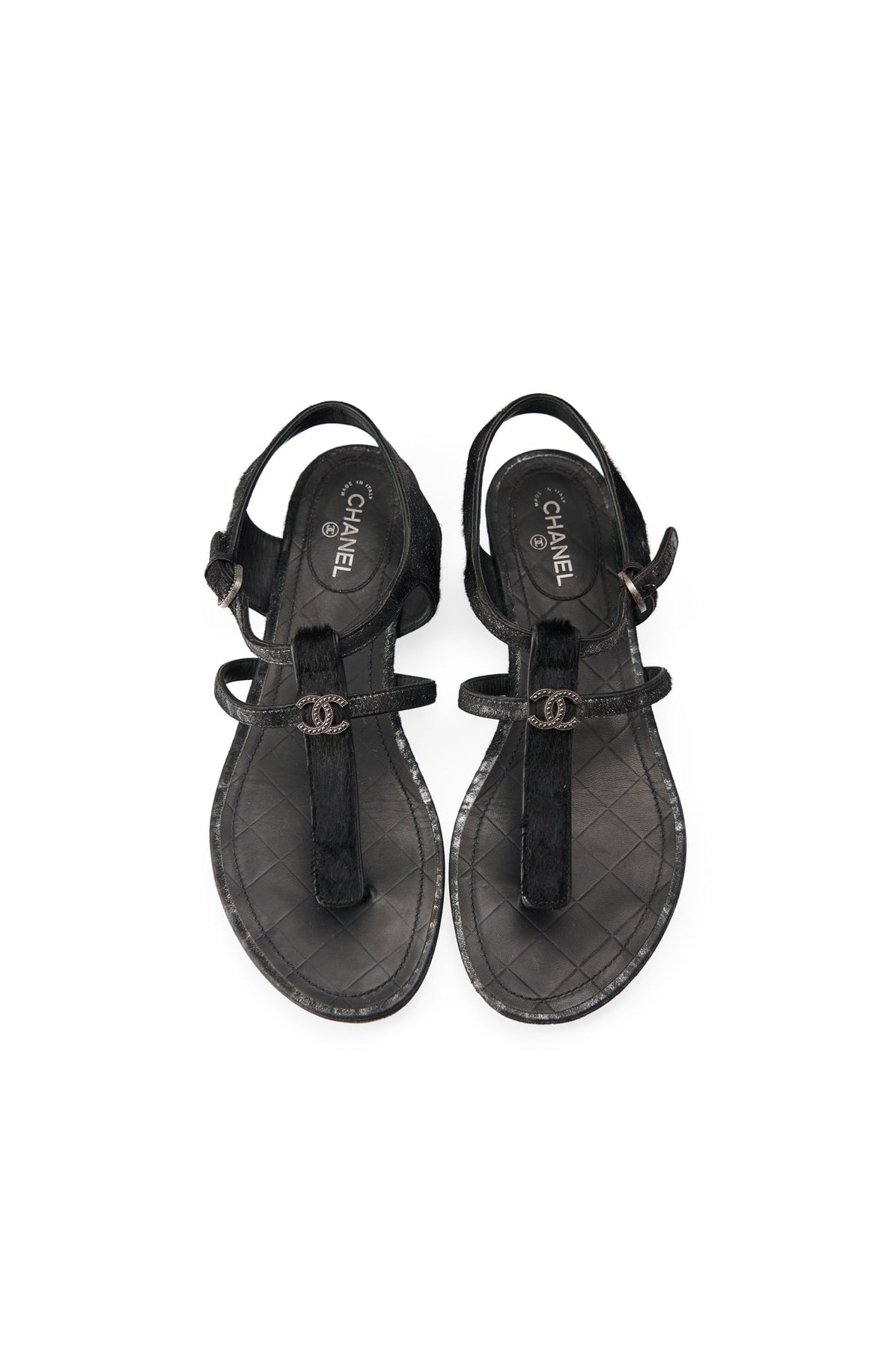 Pre-loved Chanel Metallic Pony Hair Thong Sandals in black