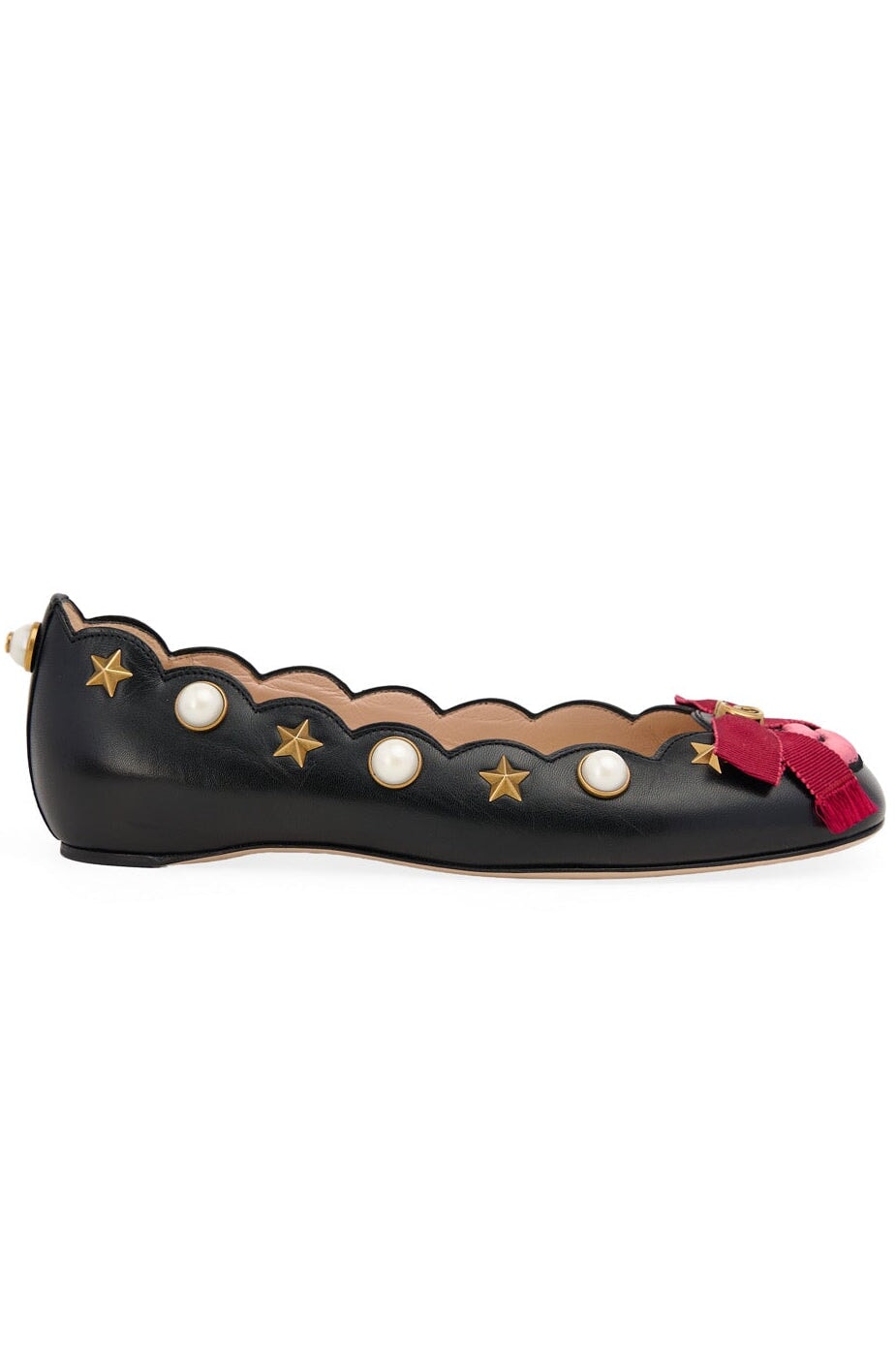 Star and faux pearl embellishments with GG emblem on grosgrain bow