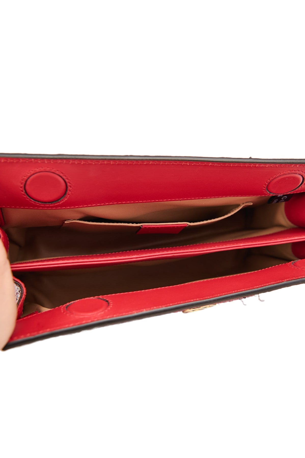 Beige leather interior with two sections, one with a pocket