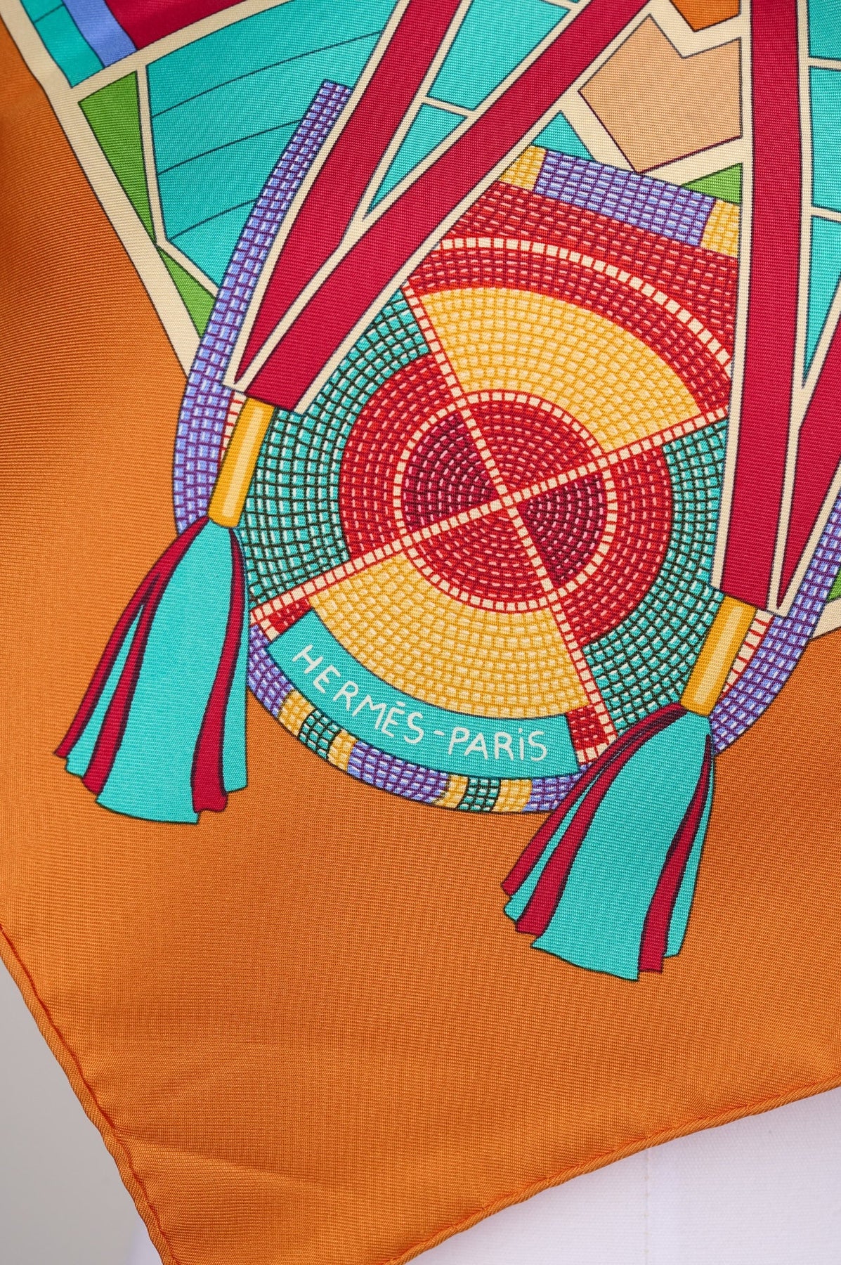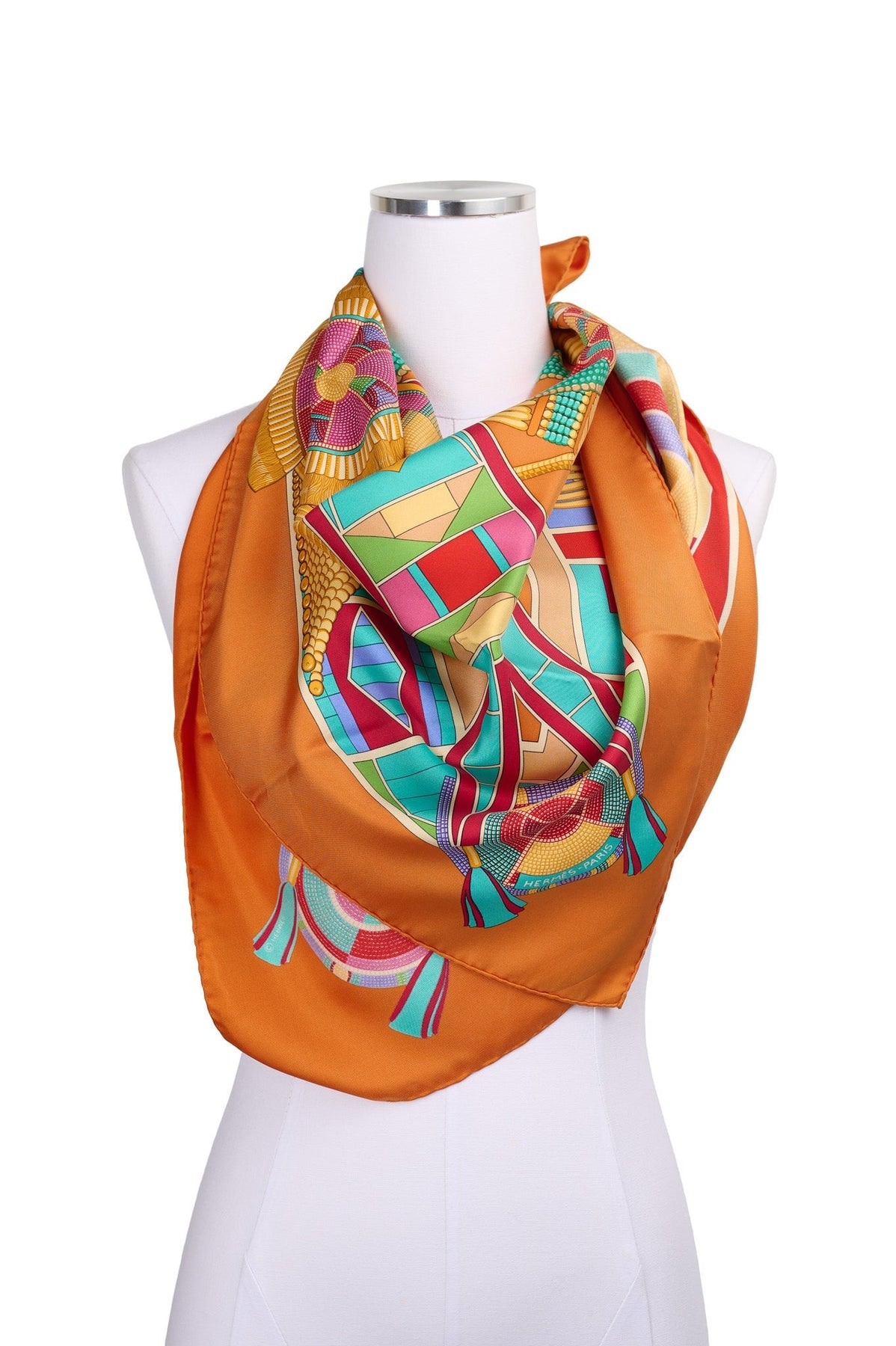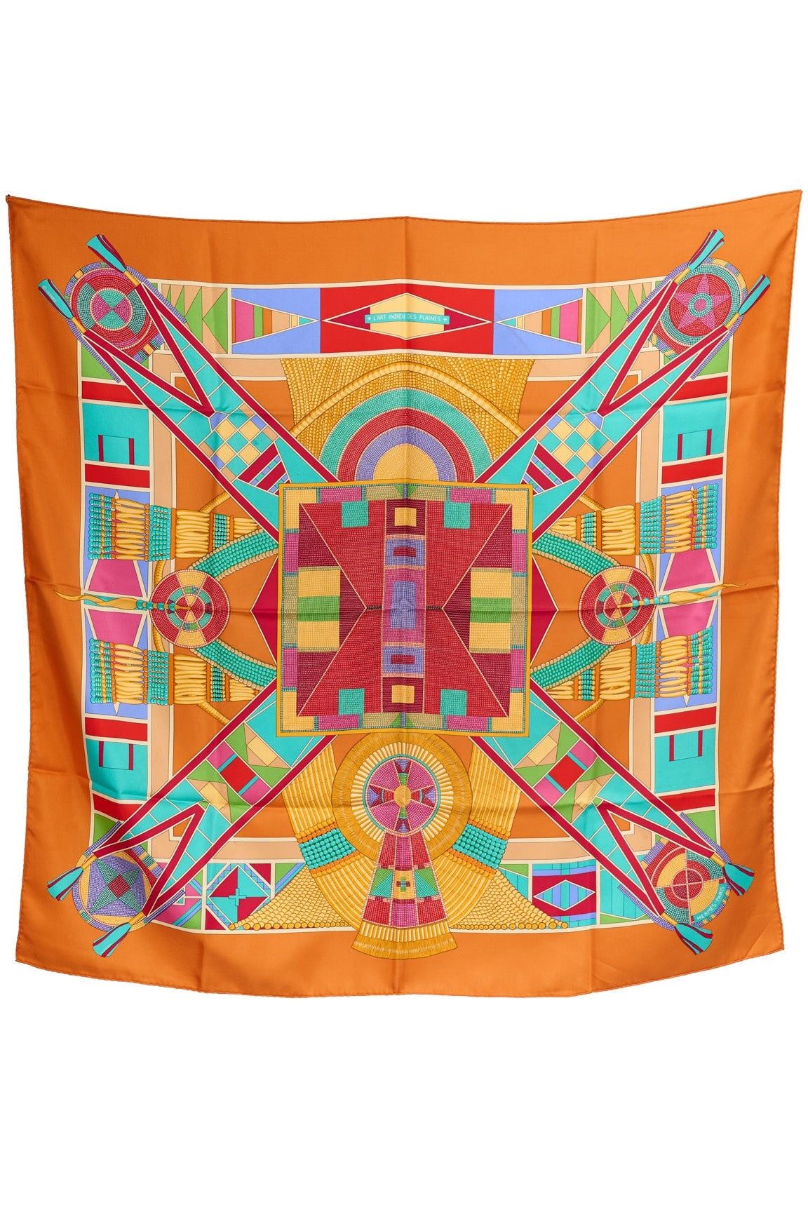 Pre-loved Hermes L'art Indien des Plaines Silk Scarf in orange, teal, and red