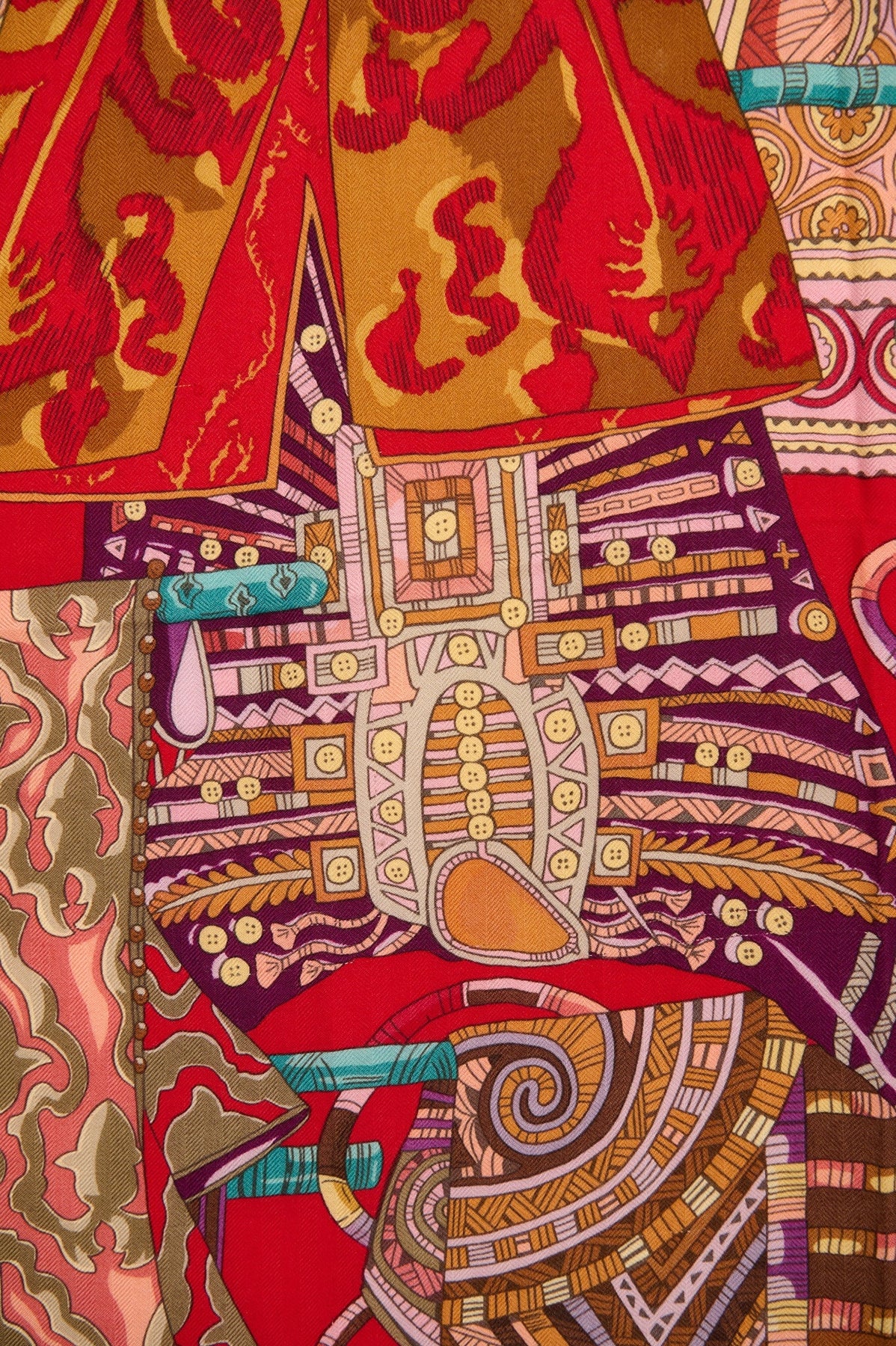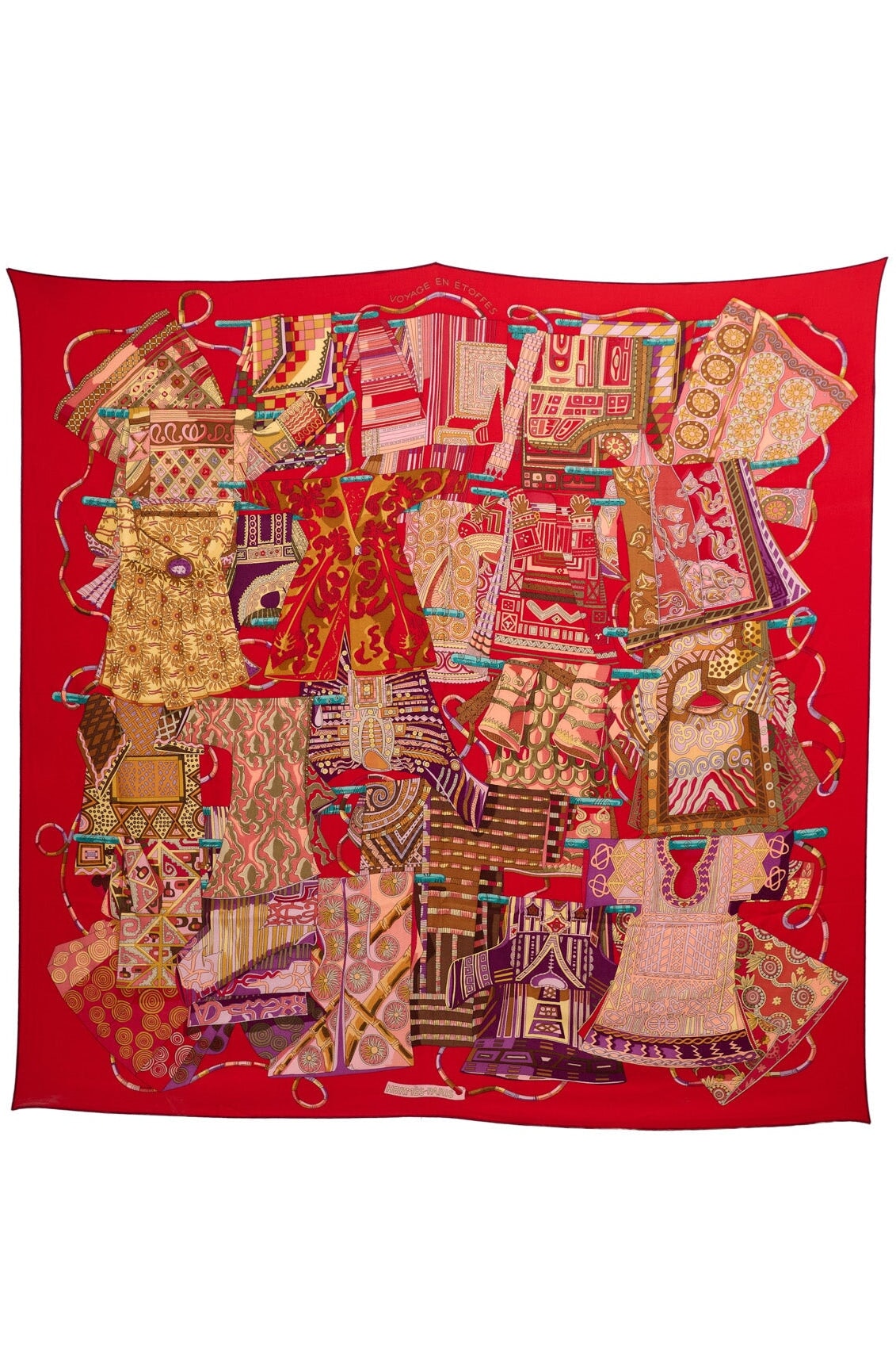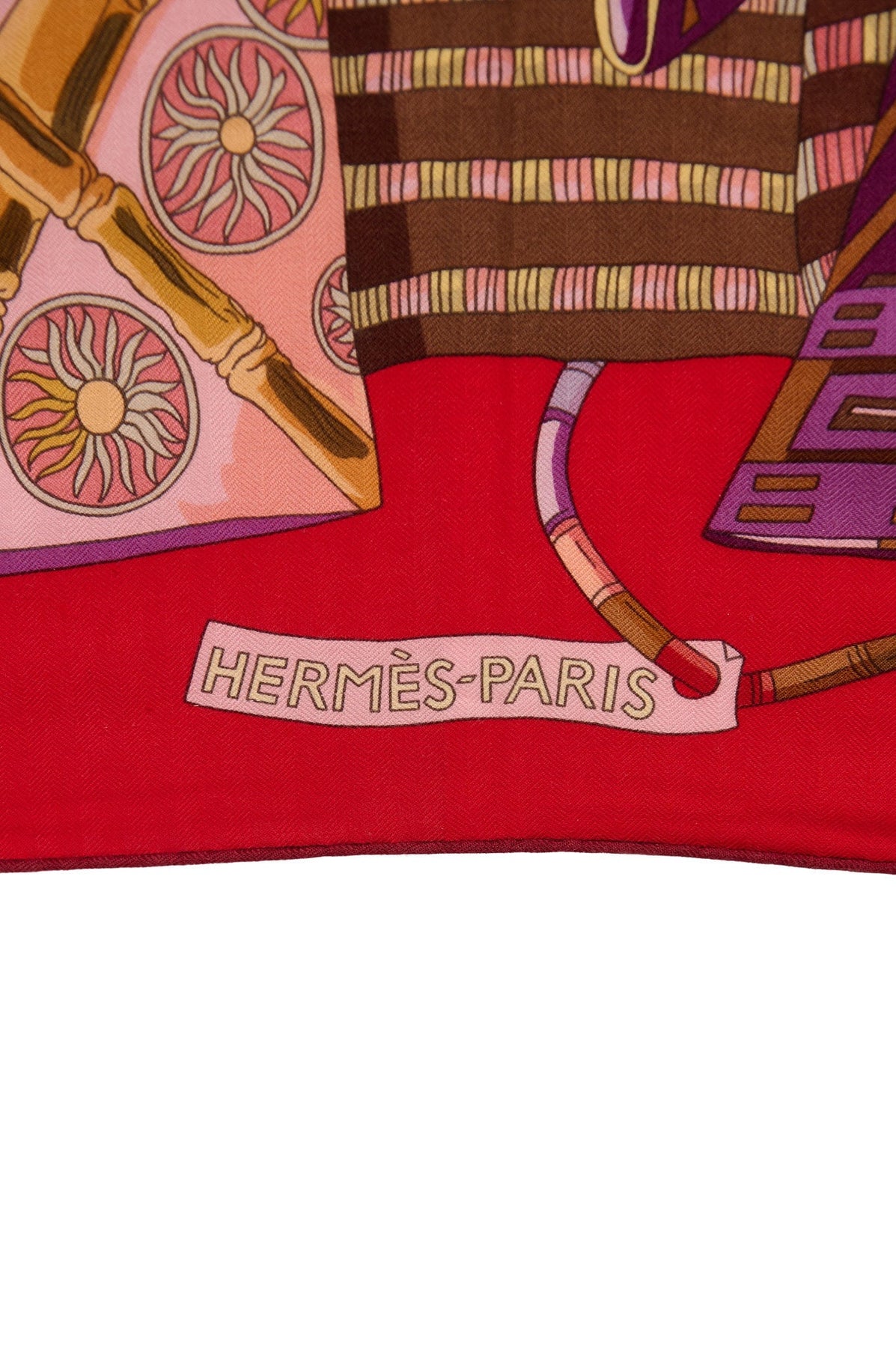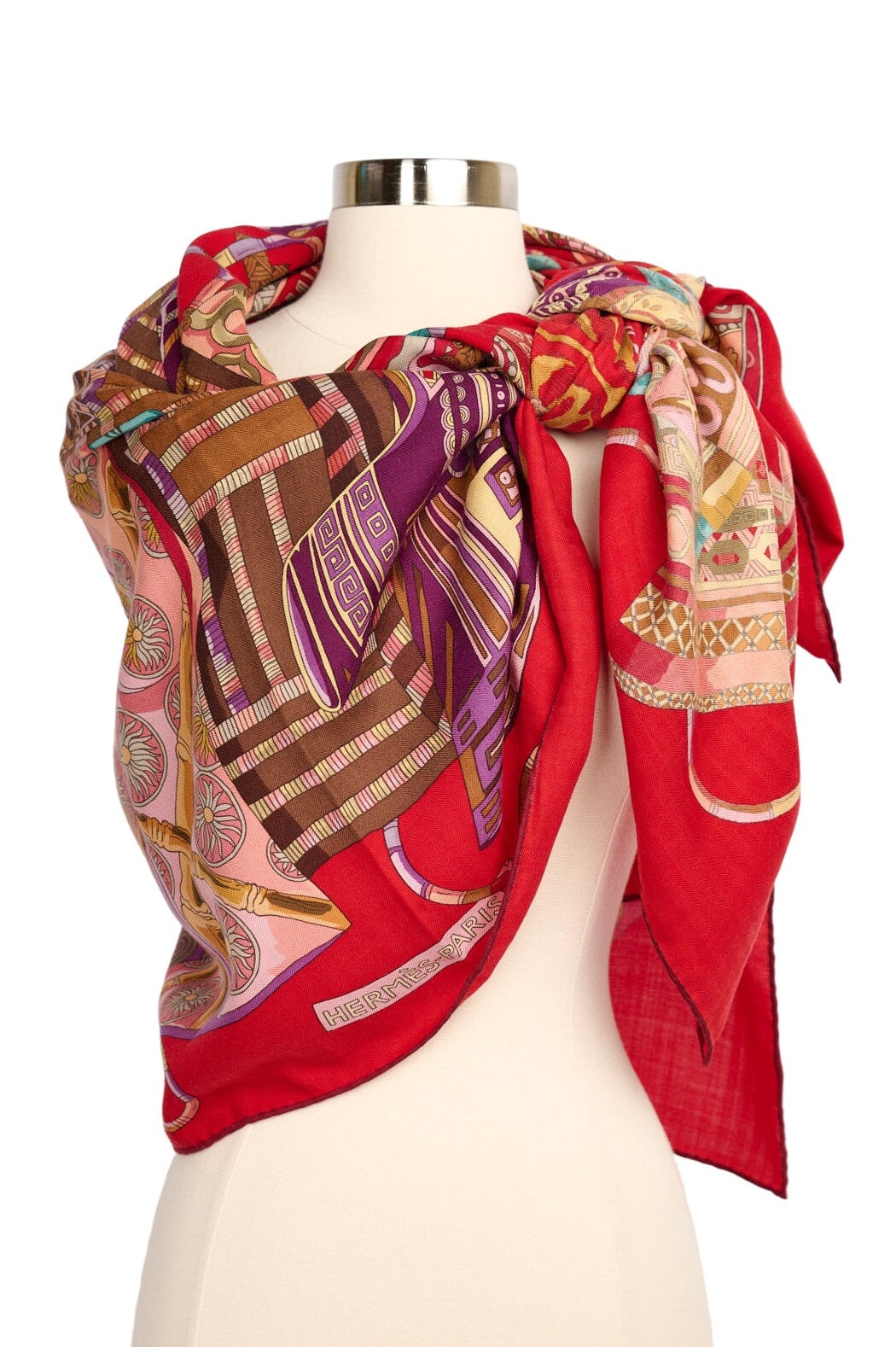 Pre-loved Hermes Voyage en Etoffes Libris Stole Scarf in red, taupe and purple