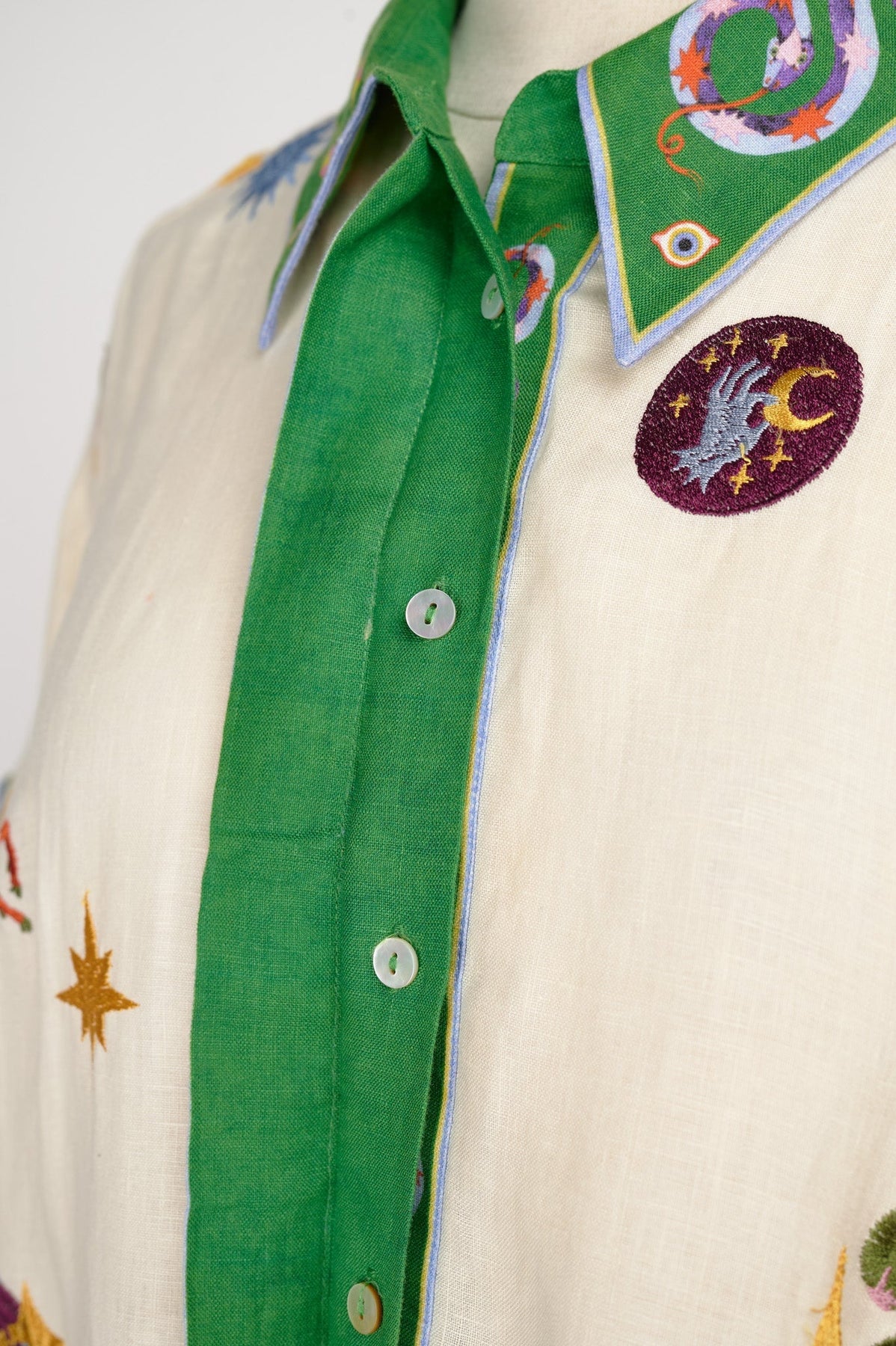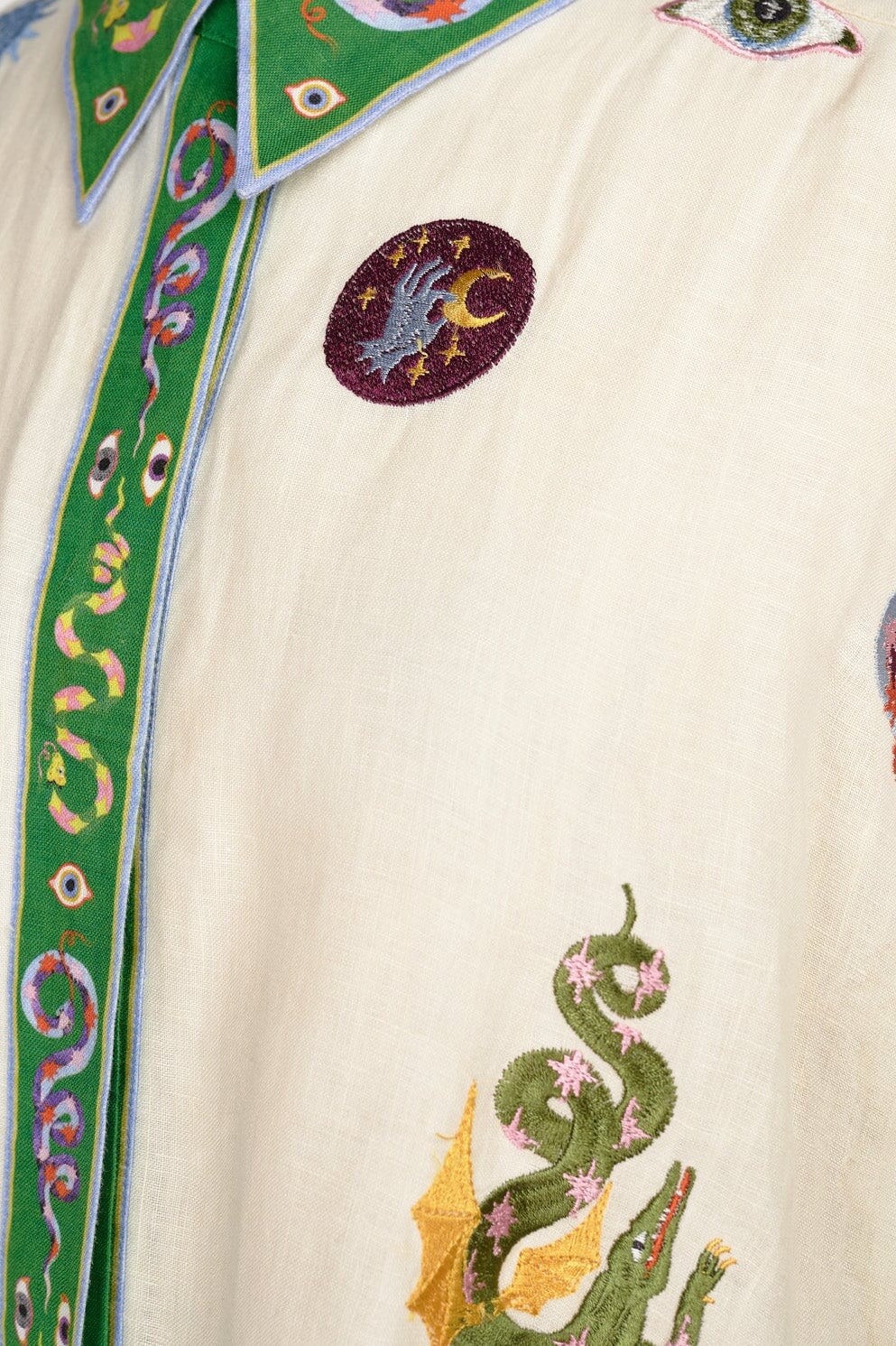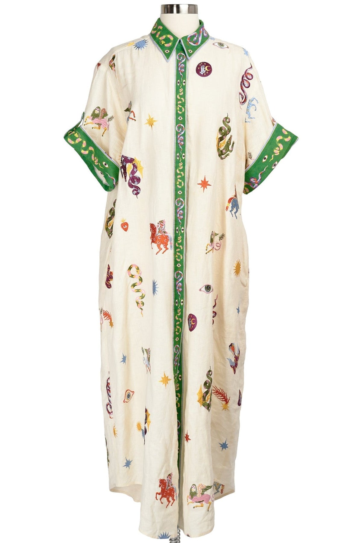 Alemais Seeker Embroidered Shirt Dress in cream, green, orange, and purple