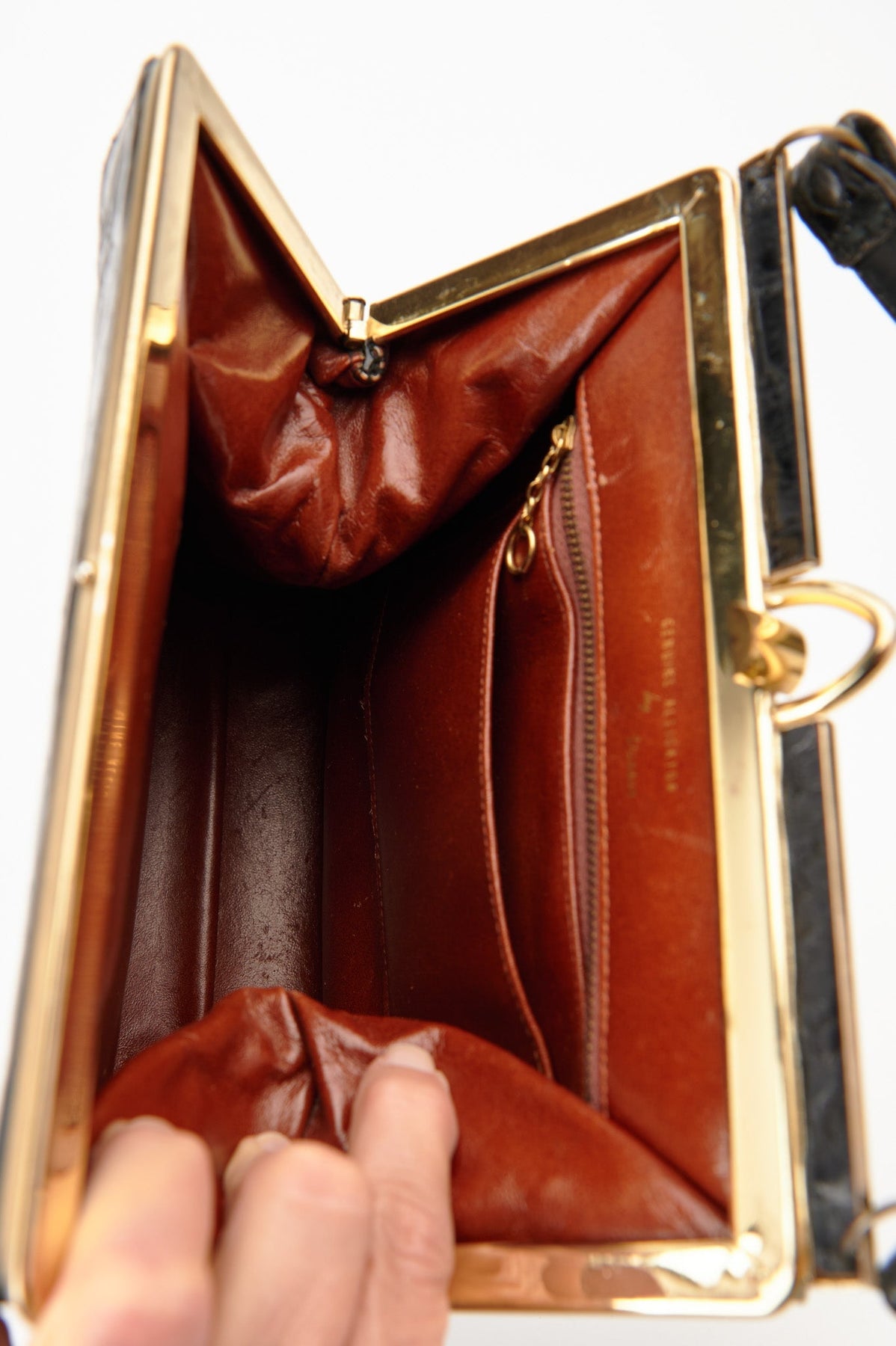 Brown leather interior with two pockets, one with a zipper